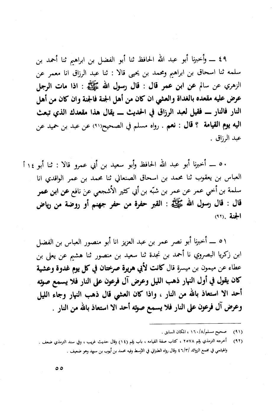 ٤٩ - وَأَخْبَرَنَا أَبُو عَبْدِ اللَّهِ الْحَافِظُ، ثَنَا أَبُو الْفَضْلِ بْنُ إِبْرَاهِيمَ، ثَنَا أَحْمَدُ بْنُ سَلَمَةَ، ثَنَا إِسْحَاقُ بْنُ إِبْرَاهِيمَ، وَمُحَمَّدُ بْنُ يَحْيَى قَالَا: ثَنَا عَبْدُ الرَّزَّاقِ، أَنَا مَعْمَرٌ، عَنِ الزُّهْرِيِّ، عَنْ سَالِمٍ، عَنِ ابْنِ عُمَرَ قَالَ: قَالَ رَسُولُ اللَّهِ صَلَّى اللَّهُ عَلَيْهِ وَسَلَّم: «إِذَا مَاتَ الرَّجُلُ عُرِضَ عَلَيْهِ مَقْعَدُهُ بِالْغَدَاةِ وَالْعَشِيِّ، إِنْ كَانَ مِنْ أَهْلِ الْجَنَّةِ فَالْجَنَّةُ، وَإِنْ كَانَ مِنْ أَهْلِ النَّارِ فَالنَّارُ» فَقِيلَ لِعَبْدِ الرَّزَّاقِ فِي الْحَدِيثِ يُقَالُ: هَذَا مَقْعَدُكَ الَّذِي تُبْعَثُ إِلَيْهِ يَوْمَ الْقِيَامَةِ؟ قَالَ: نَعَمْ " رَوَاهُ مُسْلِمٌ فِي الصَّحِيحِ عَنْ عَبْدِ بْنِ حُمَيْدٍ عَنْ عَبْدِ الرَّزَّاقِ