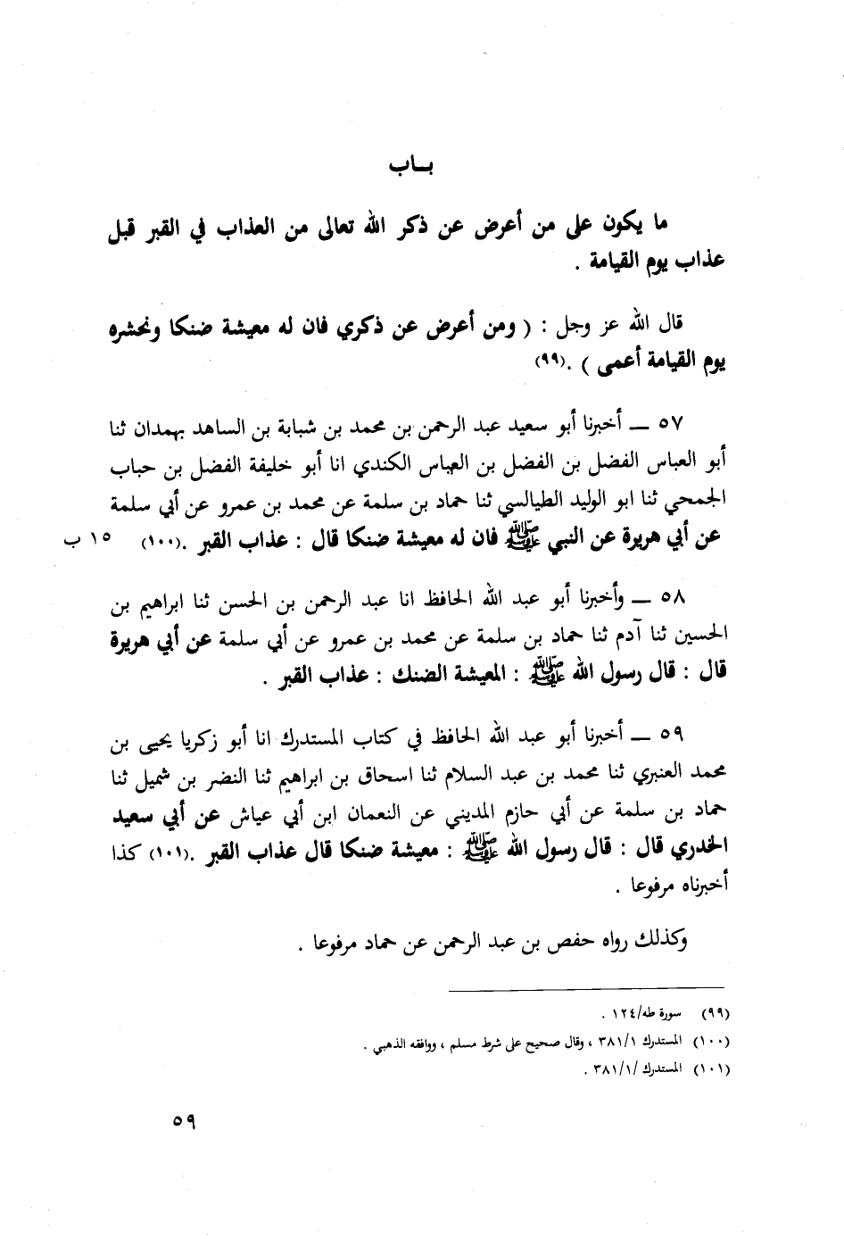 ٥٩ - أَخْبَرَنَا أَبُو عَبْدِ اللَّهِ الْحَافِظُ، فِي كِتَابِ الْمُسْتَدْرَكِ، أَنَا أَبُو زَكَرِيَّا يَحْيَى بْنُ مُحَمَّدٍ الْعَنْبَرِيُّ، ثَنَا مُحَمَّدُ بْنُ عَبْدِ السَّلَامِ، ثَنَا إِسْحَاقُ بْنُ إِبْرَاهِيمَ، ثَنَا النَّضْرُ بْنُ شُمَيْلٍ، ثَنَا حَمَّادُ بْنُ سَلَمَةَ، عَنْ أَبِي حَازِمٍ الْمَدِينِيِّ، عَنِ النُّعْمَانِ بْنِ أَبِي عَيَّاشٍ، عَنْ أَبِي سَعِيدٍ الْخُدْرِيِّ قَالَ: قَالَ رَسُولُ اللَّهِ صَلَّى اللهُ عَلَيْهِ وَسَلَّمَ: {مَعِيشَةً ضَنْكًا} [طه: ١٢٤] قَالَ: «عَذَابُ الْقَبْرِ» كَذَا أَخْبَرَنَاهُ مَرْفُوعًا وَكَذَلِكَ رَوَاهُ حَفْصُ بْنُ عَبْدِ الرَّحْمَنِ عَنْ حَمَّادٍ مَرْفُوعًا