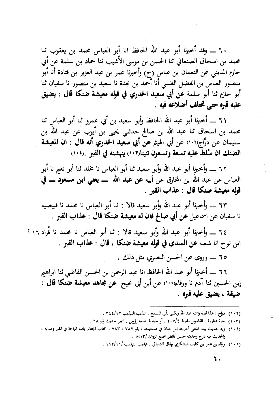 ٦٠ - وَقَدْ أَخْبَرَنَا أَبُو عَبْدِ اللَّهِ الْحَافِظُ، أَنَا أَبُو الْعَبَّاسِ مُحَمَّدُ بْنُ يَعْقُوبَ، ثَنَا مُحَمَّدُ بْنُ إِسْحَاقَ الصّاغَانِيُّ، ثَنَا الْحَسَنُ بْنُ مُوسَى الْأَشْيَبُ، ثَنَا حَمَّادُ بْنُ سَلَمَةَ، عَنْ أَبِي حَازِمٍ الْمَدِينِيِّ، عَنِ النُّعْمَانِ بْنِ أَبِي عَيَّاشٍ ح، وَأَخْبَرَنَا عُمَرُ بْنُ عَبْدِ الْعَزِيزِ بْنِ قَتَادَةَ، أَنَا أَبُو مَنْصُورٍ الْعَبَّاسُ بْنُ الْفَضْلِ الضَّبِّيُّ، أَنَا أَحْمَدُ بْنُ نَجْدَةَ، نَا سَعِيدُ بْنُ مَنْصُورٍ، نَا سُفْيَانُ، ثَنَا أَبُو حَازِمٍ، ثَنَا أَبُو سَلَمَةَ، عَنْ أَبِي سَعِيدٍ الْخُدْرِيِّ فِي قَوْلِهِ {مَعِيشَةً ضَنْكًا} [طه: ١٢٤] قَالَ: «يُضَيَّقُ عَلَيْهِ قَبْرُهُ حَتَّى تَخْتَلِفَ أَضْلَاعُهُ فِيهِ»