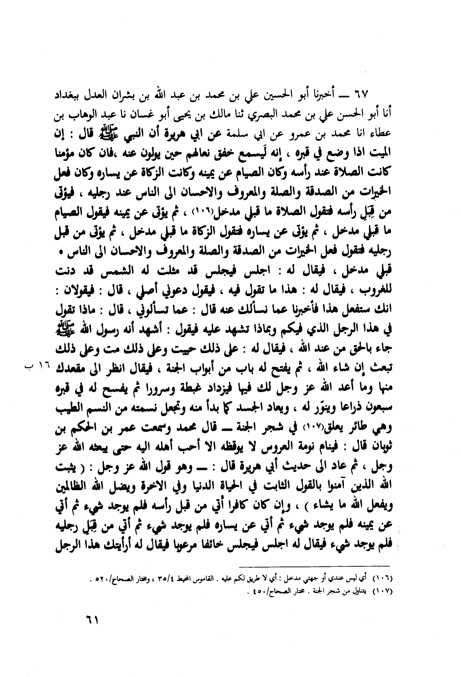 ٦٧ - أَخْبَرَنَا أَبُو الْحُسَيْنِ عَلِيُّ بْنُ مُحَمَّدِ بْنِ عَبْدِ اللَّهِ بْنِ بِشْرَانَ الْعَدْلُ بِبَغْدَادَ، أَنَا أَبُو الْحَسَنِ عَلِيُّ بْنُ مُحَمَّدٍ الْبَصْرِيُّ، ثَنَا مَالِكُ بْنُ يَحْيَى أَبُو غَسَّانَ، نَا عَبْدُ الْوَهَّابِ بْنُ عَطَاءٍ، أَنَا مُحَمَّدُ بْنُ عَمْرٍو، عَنْ أَبِي سَلَمَةَ، عَنْ أَبِي هُرَيْرَةَ أَنَّ النَّبِيَّ صَلَّى اللهُ عَلَيْهِ وَسَلَّمَ قَالَ: " إِنَّ الْمَيِّتَ إِذَا وُضِعَ فِي قَبْرِهِ إِنَّهُ لَيَسْمَعُ خَفْقَ نِعَالِهِمْ حِينَ يُوَلَّوْنَ عَنْهُ فَإِنْ كَانَ مُؤْمِنًا كَانَتِ الصَّلَاةُ عِنْدَ رَأْسِهِ، وَكَانَ الصِّيَامُ عَنْ يَمِينِهِ وَكَانَتِ الزَّكَاةُ عَنْ يَسَارِهِ، وَكَانَ فِعْلُ الْخَيْرَاتِ مِنَ الصَّدَقَةِ وَالصِّلَةِ وَالْمَعْرُوفِ وَالْإِحْسَانِ إِلَى النَّاسِ عِنْدَ رِجْلَيْهِ، فَيُؤْتَى مِنْ قِبَلِ رَأْسِهِ فَتَقُولُ الصَّلَاةُ: مَا قِبَلِي مَدْخَلٌ، ثُمَّ يُؤْتَى عَنْ يَمِينِهِ فَيَقُولُ الصِّيَامُ: مَا قِبَلِي مَدْخَلٌ، ثُمَّ يُؤْتَى عَنْ يَسَارِهِ فَتَقُولُ الزَّكَاةُ " مَا قِبَلِي مَدْخَلٌ، ثُمَّ يُؤْتَى مِنْ قِبَلِ رِجْلَيْهِ، فَتَقُولُ: فَعَلَ الْخَيْرَاتِ مِنَ الصَّدَقَةِ وَالصِّلَةِ وَالْمَعْرُوفِ وَالْإِحْسَانِ إِلَى النَّاسِ مَا قِبَلِي مَدْخَلٌ، فَيُقَالُ لَهُ: اجْلِسْ فَيَجْلِسُ قَدْ مُثِّلَتْ لَهُ الشَّمْسُ قَدْ دَنَتْ لِلْغُرُوبِ، فَيُقَالُ لَهُ: هَذَا مَا تَقُولُ فِيهِ؟ فَيَقُولُ: دَعُونِي أُصَلِّي قَالَ: فَيَقُولَانِ: إِنَّكَ سَتَفْعَلُ هَذَا فَأَخْبِرْنَا عَمَّا نَسْأَلُكَ عَنْهُ قَالَ: عَمَّا تَسْأَلُونِي؟ قَالَ: مَاذَا تَقُولُ فِي هَذَا الرَّجُلِ الَّذِي فِيكُمْ وَبِمَ تَشْهَدُ عَلَيْهِ؟ فَيَقُولُ: أَشْهَدُ أَنَّهُ رَسُولُ اللَّهِ صَلَّى اللهُ عَلَيْهِ وَسَلَّمَ جَاءَ بِالْحَقِّ مِنْ عِنْدِ اللَّهِ، فَيُقَالُ لَهُ: عَلَى ذَلِكَ حَيِيتَ وَعَلَى ذَلِكَ مِتَّ وَعَلَى ذَلِكَ تُبْعَثُ إِنْ شَاءَ اللَّهُ، ثُمَّ يُفْتَحُ لَهُ بَابٌ مِنْ أَبْوَابِ الْجَنَّةِ فَيُقَالُ: انْظُرْ إِلَى مَقْعَدِكَ مِنْهَا وَمَا أَعَدَّ اللَّهُ عَزَّ وَجَلَّ لَكَ فِيهَا فَيَزْدَادُ غِبْطَةً وَسُرُورًا، ثُمَّ يُفْسَحُ لَهُ فِي قَبْرِهِ سَبْعُونَ ذِرَاعًا وَيُنَوَّرُ لَهُ وَيُعَادُ الْجَسَدُ كَمَا بَدَأَ، وَتُجْعَلُ نَسْمَتُهُ مِنَ النَّسِيمِ الطَّيِّبِ وَهُوَ طَائِرٌ يَعْلَقُ فِي شَجَرِ الْجَنَّةِ " قَالَ مُحَمَّدٌ: وَسَمِعْتُ عُمَرَ بْنَ الْحَكَمِ بْنِ ثَوْبَانَ قَالَ: «فَيَنَامُ نَوْمَةَ الْعَرُوسِ لَا يُوقِظُهُ إِلَّا أَحَبُّ أَهْلِهِ إِلَيْهِ حَتَّى يَبْعَثَهُ اللَّهُ عَزَّ وَجَلَّ» ثُمَّ عَادَ إِلَى حَدِيثِ أَبِي هُرَيْرَةَ قَالَ: " وَهُوَ قَوْلُ اللَّهِ عَزَّ وَجَلَّ {يُثَبِّتُ اللَّهُ الَّذِينَ آمَنُوا بِالْقَوْلِ الثَّابِتِ فِي الْحَيَاةِ الدُّنْيَا وَفِي الْآخِرَةِ وَيُضِلُّ اللَّهُ الظَّالِمِينَ وَيَفْعَلُ اللَّهُ مَا يَشَاءُ} [إبراهيم: ٢٧] وَإِنْ كَانَ كَافِرًا أُتِيَ مِنْ قِبَلِ رَأْسِهِ فَلَمْ يُوجَدْ شَيْءٌ ثُمَّ أُتِيَ عَنْ يَمِينِهِ فَلَمْ يُوجَدْ شَيْءٌ ثُمَّ، أُتِيَ عَنْ يَسَارِهِ فَلَمْ يُوجَدْ شَيْءٌ، ثُمَّ أُتِيَ مِنْ قِبَلِ رِجْلَيْهِ فَلَمْ يُوجَدْ شَيْءٌ فَيُقَالُ لَهُ: اجْلِسْ فَيَجْلِسُ خَائِفًا مَرْعُوبًا، فَيُقَالُ لَهُ: أَرَأَيْتَكَ هَذَا الرَّجُلَ ⦗٦٢⦘ الَّذِي كَانَ فِيكُمْ أَيُّ رَجُلٍ هُوَ، مَاذَا تَقُولُ فِيهِ وَمَاذَا تَشْهَدُ بِهِ عَلَيْهِ؟ فَيَقُولُ: أَيُّ رَجُلٍ؟ فَيُقَالُ: الَّذِي كَانَ فِيكُمْ، فَلَا يَهْتَدِي لِاسْمِهِ حَتَّى يُقَالُ: مُحَمَّدٌ، فَيَقُولُ: مَا أَدْرِي سَمِعْتُ النَّاسَ قَالُوا قَوْلًا فَقُلْتُ كَمَا قَالَ النَّاسُ، فَيُقَالُ لَهُ: عَلَى ذَلِكَ حَيِيتَ، وَع