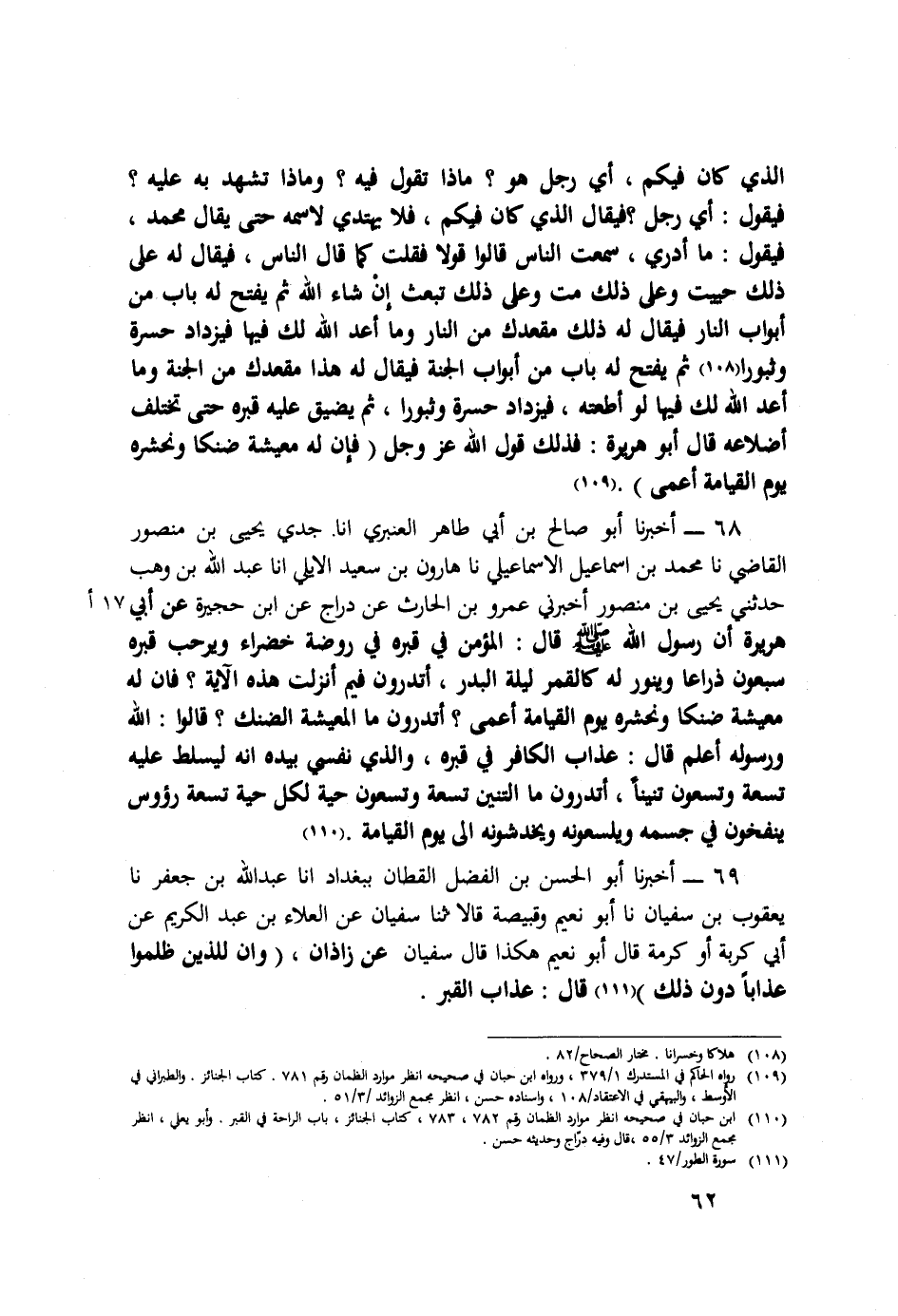 ٦٨ - أَخْبَرَنَا أَبُو صَالِحِ بْنُ أَبِي طَاهِرٍ الْعَنْبَرِيُّ، أَنَا جَدِّي يَحْيَى بْنُ مَنْصُورٍ الْقَاضِي، نَا مُحَمَّدُ بْنُ إِسْمَاعِيلَ الْإِسْمَاعِيلَيُّ، نَا هَارُونُ بْنُ سَعِيدٍ الْأَيْلِيُّ، أَنَا عَبْدُ اللَّهِ بْنُ وَهْبٍ، أَخْبَرَنِي عَمْرُو بْنُ الْحَارِثِ، عَنْ دَرَّاجٍ، عَنْ أَبِي حُجَيْرَةَ، عَنْ أَبِي هُرَيْرَةَ أَنَّ رَسُولَ اللَّهِ صَلَّى اللهُ عَلَيْهِ وَسَلَّمَ قَالَ: " الْمُؤْمِنُ فِي قَبْرِهِ فِي رَوْضَةٍ خَضْرَاءَ وَيَرْحُبُ قَبْرُهُ سَبْعِينَ ذِرَاعًا، وَيُنَوَّرُ لَهُ كَالْقَمَرِ لَيْلَةَ الْبَدْرِ، أَتَدْرُونَ فِيمَا نَزَلَتْ هَذِهِ الْآيَةُ فَإِنَّ لَهُ مَعِيشَةً ضَنْكًا وَنَحْشُرُهُ يَوْمَ الْقِيَامَةِ أَعْمَى أَتَدْرُونَ مَا الْمَعِيشَةُ الضَّنْكُ؟ قَالُوا: اللَّهُ وَرَسُولُهُ أَعْلَمُ قَالَ: عَذَابُ الْكَافِرِ فِي قَبْرِهِ، وَالَّذِي نَفْسِي بِيَدِهِ إِنَّهُ لَيُسَلَّطُ عَلَيْهِ تِسْعَةٌ وَتِسْعُونَ تِنِّينًا، أَتَدْرُونَ مَا التِّنِّينُ؟ تِسْعَةٌ وَتِسْعُونَ حَيَّةً لِكُلِّ حَيَّةٍ تِسْعَةُ رُءُوسٍ يَنْفُخُونَ فِي جِسْمِهِ وَيَلْسَعُونَهُ وَيَخْدُشُونَهُ إِلَى يَوْمِ الْقِيَامَةِ "
