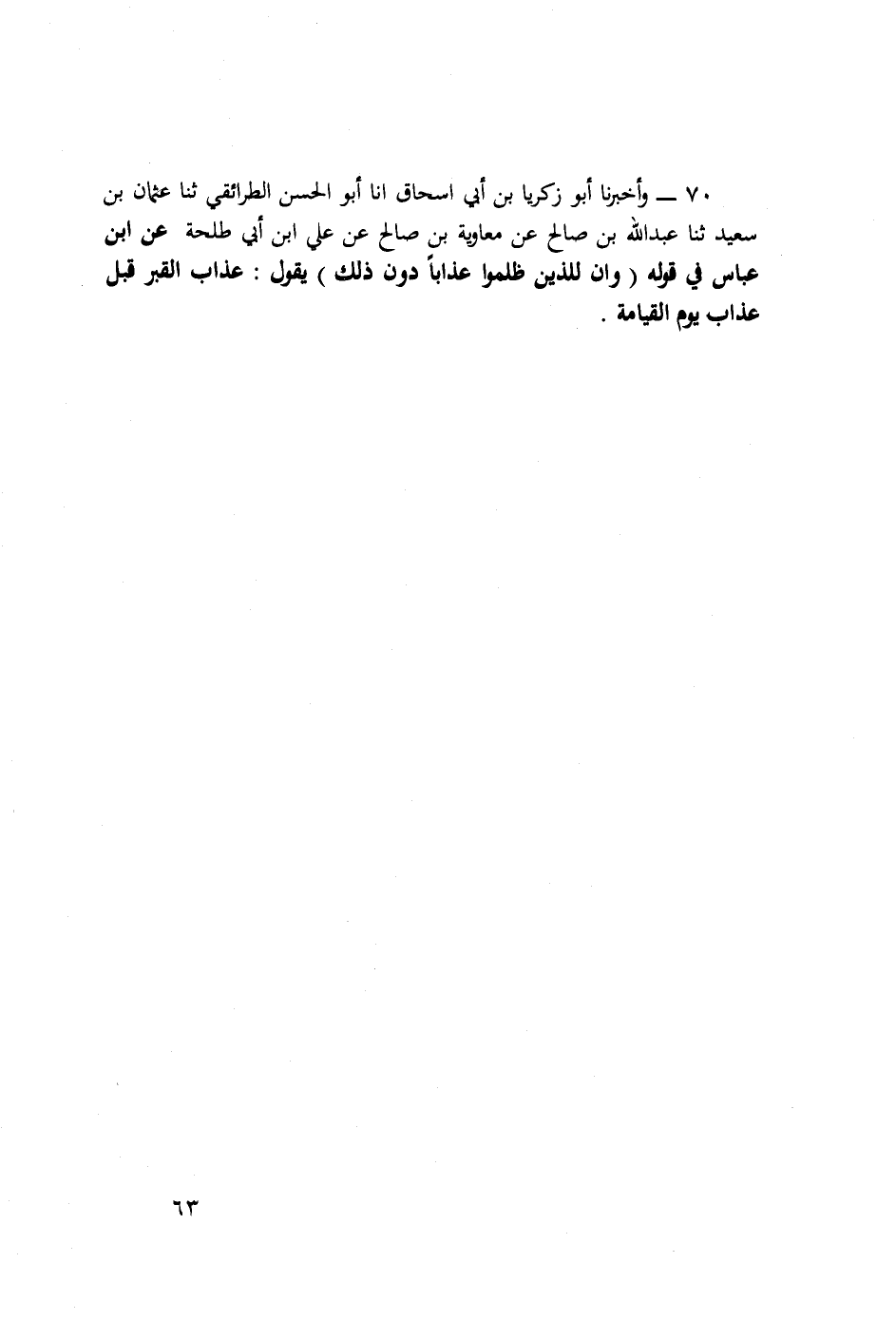 ٧٠ - وَأَخْبَرَنَا أَبُو زَكَرِيَّا بْنُ أَبِي إِسْحَاقَ، أَنَا أَبُو الْحَسَنِ الطَّرَائِقِيُّ، ثَنَا عُثْمَانُ بْنُ سَعِيدٍ، ثَنَا عَبْدُ اللَّهِ بْنُ صَالِحٍ، عَنْ مُعَاوِيَةَ بْنِ صَالِحٍ، عَنْ عَلِيِّ بْنِ أَبِي طَلْحَةَ، عَنِ ابْنِ عَبَّاسٍ فِي قَوْلِهِ {وَإِنَّ لِلَّذِينَ ظَلَمُوا عَذَابًا دُونَ ذَلِكَ} [الطور: ٤٧] يَقُولُ: «عَذَابُ الْقَبْرِ قَبْلَ عَذَابِ يَوْمِ الْقِيَامَةِ»