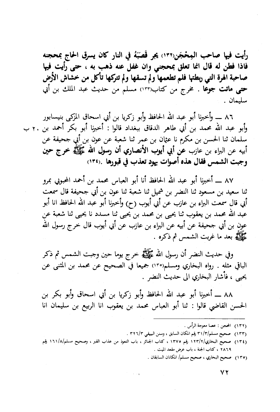 ٨٦ - وَأَخْبَرَنَا أَبُو عَبْدِ اللَّهِ الْحَافِظُ، وَأَبُو زَكَرِيَّا بْنُ أَبِي إِسْحَاقَ الْمُزَكِّي بِنَيْسَابُورَ، وَأَبُو عَبْدِ اللَّهِ مُحَمَّدُ بْنُ أَبِي طَاهِرٍ الدَّقَّاقُ بِبَغْدَادَ قَالُوا: أَخْبَرَنَا أَبُو بَكْرٍ أَحْمَدُ بْنُ سُلَيْمَانَ، ثَنَا الْحَسَنُ بْنُ مُكْرَمٍ، نَا عُثْمَانُ بْنُ عُمَرَ، ثَنَا شُعْبَةُ، عَنْ عَوْنِ بْنِ أَبِي جُحَيْفَةَ، عَنْ أَبِيهِ، عَنِ الْبَرَاءِ بْنِ عَازِبٍ، عَنْ أَبِي أَيُّوبَ الْأَنْصَارِيِّ أَنَّ رَسُولَ اللَّهِ صَلَّى اللهُ عَلَيْهِ وَسَلَّم خَرَجَ حِينَ وَجَبَتِ الشَّمْسُ فَقَالَ: «هَذِهِ أَصْوَاتَ يَهُودٍ تُعَذَّبُ فِي قُبُورِهَا»