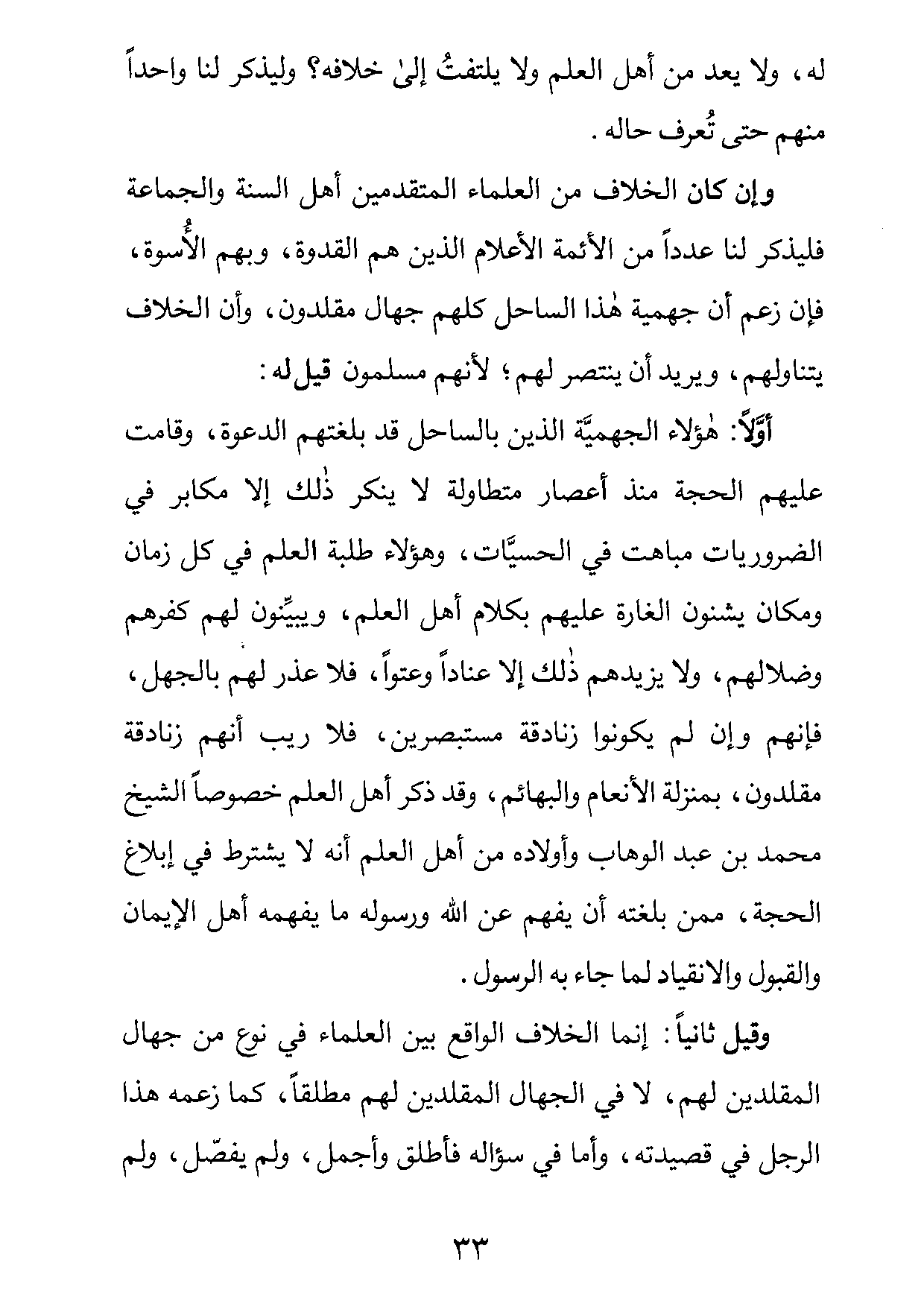 وَإِن كَانَ الْخلاف من الْعلمَاء الْمُتَقَدِّمين أهل السّنة وَالْجَمَاعَة فليذكر لنا عددا من الْأَئِمَّة الْأَعْلَام الَّذين هم الْقدْوَة وبهم الأسوة فَإِن زعم أَن جهمية هَذَا السَّاحِل كلهم جهال مقلدون وَأَن الْخلاف يتناولهم وَيُرِيد أَن ينتصر لَهُم لأَنهم مُسلمُونَ قيل لَهُ