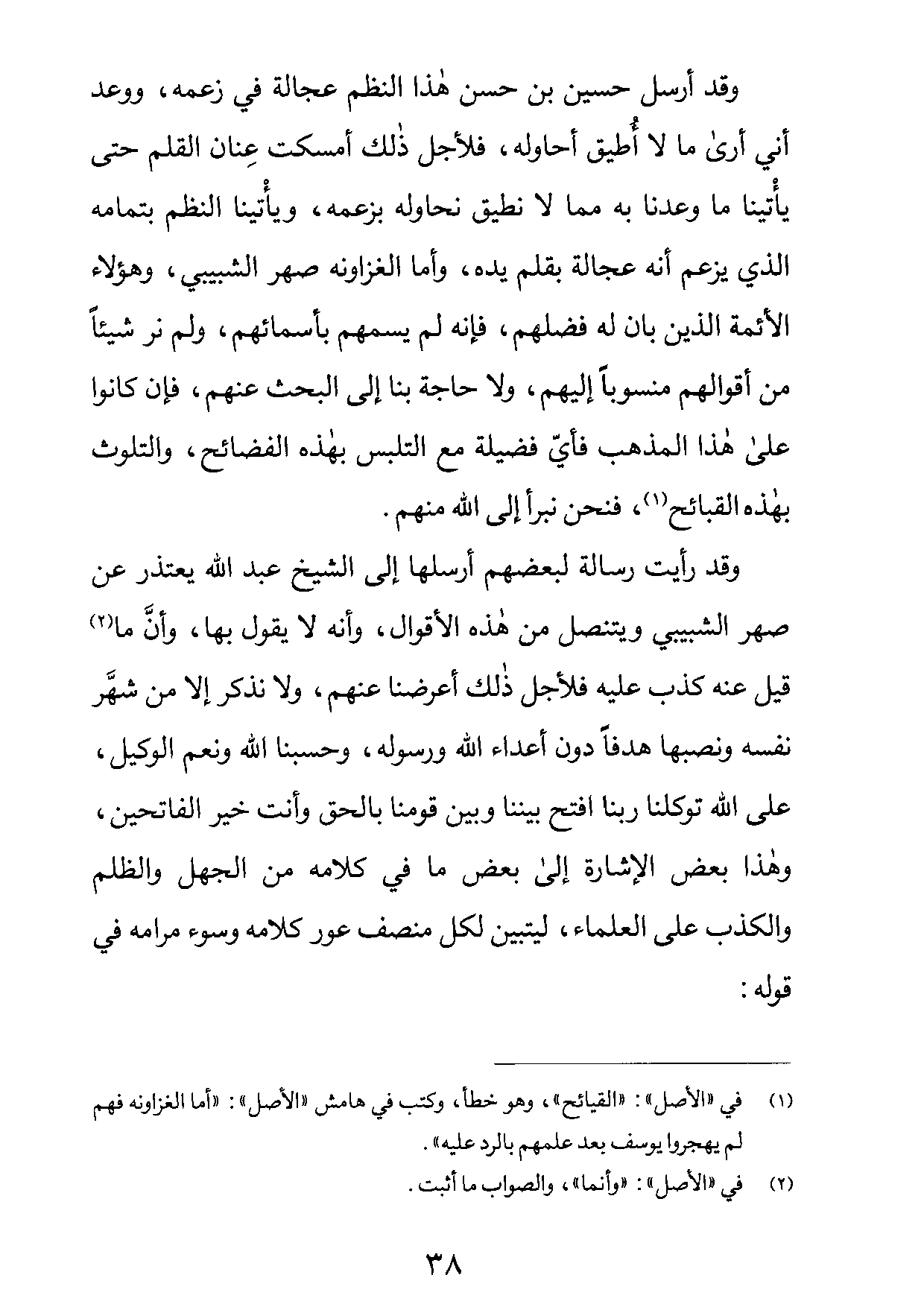 وَقد رَأَيْت رِسَالَة لبَعْضهِم أرسلها إِلَى الشَّيْخ عبد الله يعْتَذر عَن صهر الشبيبي ويتنصل من هَذِه الْأَقْوَال وَأَنه لَا يَقُول بهَا وَأَن مَا قيل عَنهُ كذب عَلَيْهِ فلأجل ذَلِك أعرضنا عَنْهُم وَلَا نذْكر إِلَّا من شهر نَفسه ونصبها هدفا دون أَعدَاء الله وَرَسُوله وحسبنا الله وَنعم الْوَكِيل على الله توكلنا رَبنَا افْتَحْ بَيْننَا وَبَين قَومنَا بِالْحَقِّ وَأَنت خير الفاتحين وَهَذَا بعض الْإِشَارَة إِلَى بعض مَا فِي كَلَامه من الْجَهْل وَالظُّلم وَالْكذب على الْعلمَاء ليتبين لكل منصف عور كَلَامه وَسُوء مرامه فِي قَوْله