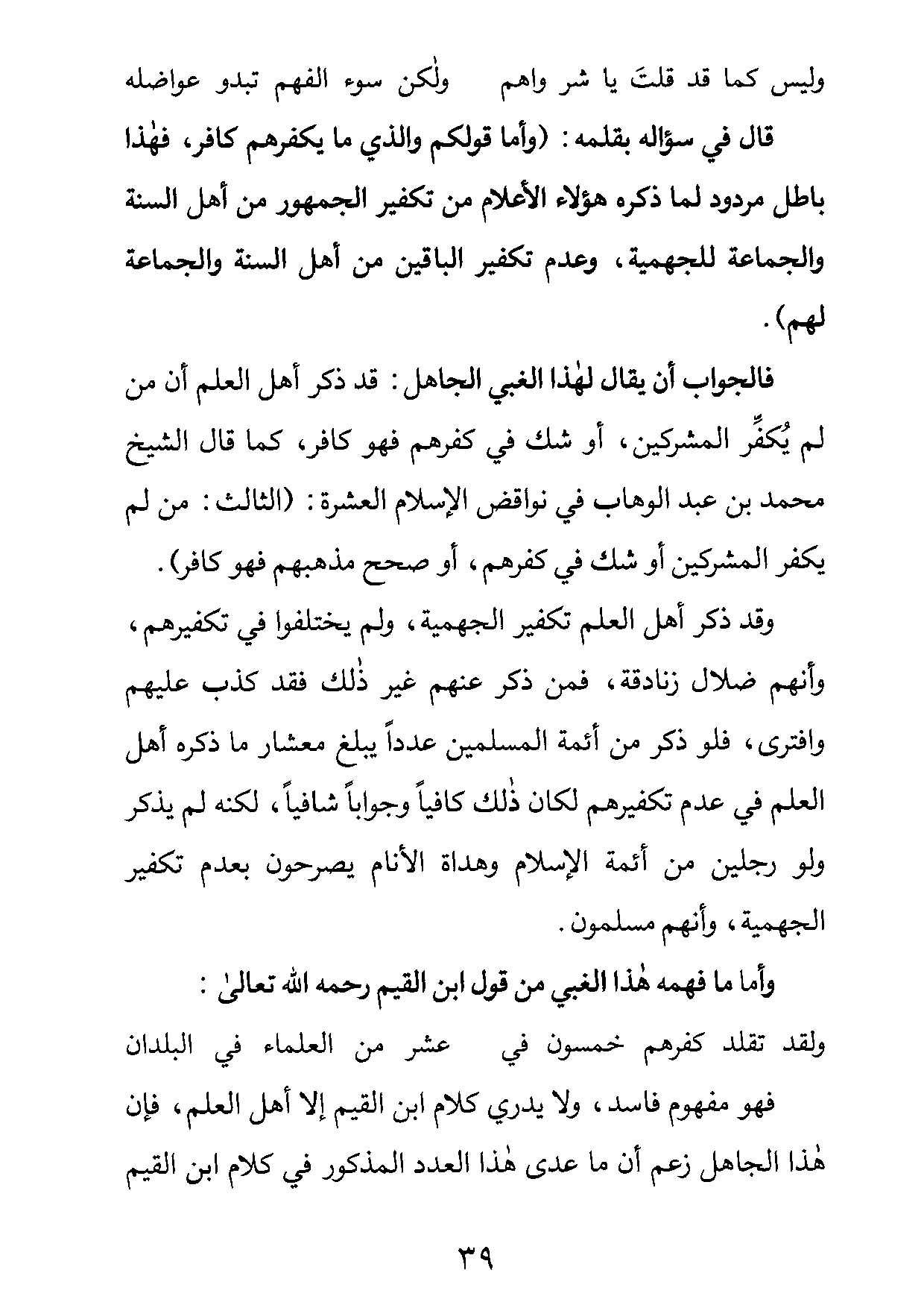وَقد ذكر أهل الْعلم تَكْفِير الْجَهْمِية وَلم يَخْتَلِفُوا فِي تكفيرهم وَأَنَّهُمْ ضلال زنادقة فَمن ذكر عَنْهُم غير ذَلِك فقد كذب عَلَيْهِم وافترى فَلَو ذكر من أَئِمَّة الْمُسلمين عددا يبلغ معشار مَا ذكره أهل الْعلم فِي عدم تكفيرهم لَكَانَ ذَلِك كَافِيا وجوابا شافيا لكنه لم يذكر وَلَو رجلَيْنِ من أَئِمَّة الْإِسْلَام وَهُدَاة الْأَنَام يصرحون بِعَدَمِ تَكْفِير الْجَهْمِية وَأَنَّهُمْ مُسلمُونَ