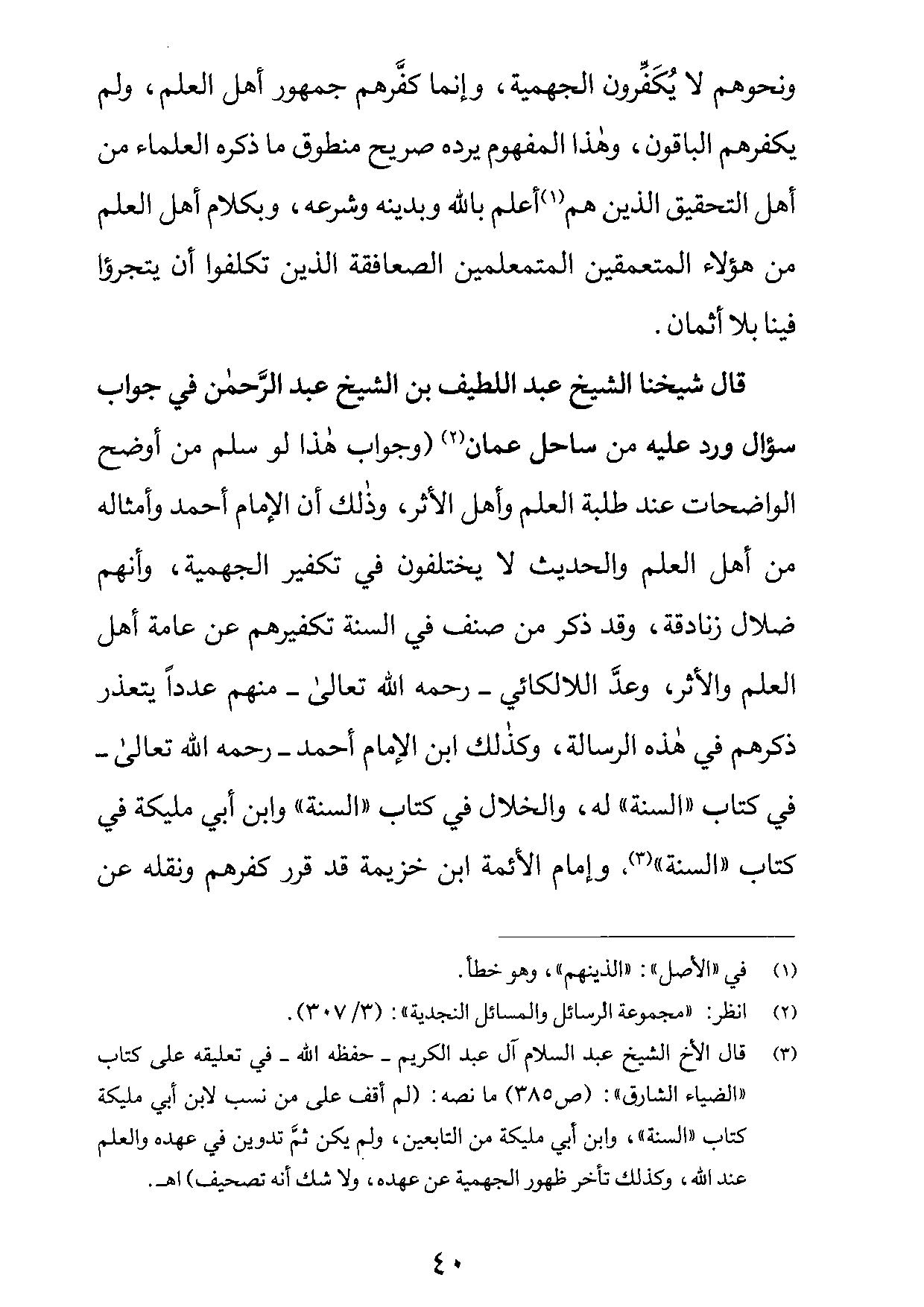قَالَ شَيخنَا الشَّيْخ عبد اللَّطِيف بن الشَّيْخ عبد الرَّحْمَن فِي جَوَاب سُؤال ورد عَلَيْهِ من سَاحل عمان وَجَوَاب هَذَا لَو سلم من أوضح الواضحات عِنْد طلبة الْعلم وَأهل الْأَثر وَذَلِكَ أَن الإِمَام أَحْمد وَأَمْثَاله من أهل الْعلم والْحَدِيث لَا يَخْتَلِفُونَ فِي تَكْفِير الْجَهْمِية وَأَنَّهُمْ ضلال زنادقة وَقد ذكر من صنف فِي السّنة تكفيرهم عَن عَامَّة أهل الْعلم والأثر وعد اللالكائي رَحمَه الله تَعَالَى مِنْهُم عددا يتَعَذَّر ذكرهم فِي هَذِه الرسَالَة وَكَذَلِكَ ابْن الإِمَام أَحْمد رَحمَه الله تَعَالَى فِي كتاب السّنة والخلال فِي كتاب السّنة وَابْن أبي مليكَة فِي كتاب السّنة وَإِمَام الْأَئِمَّة ابْن خُزَيْمَة قد قرر كفرهم وَنَقله عَن