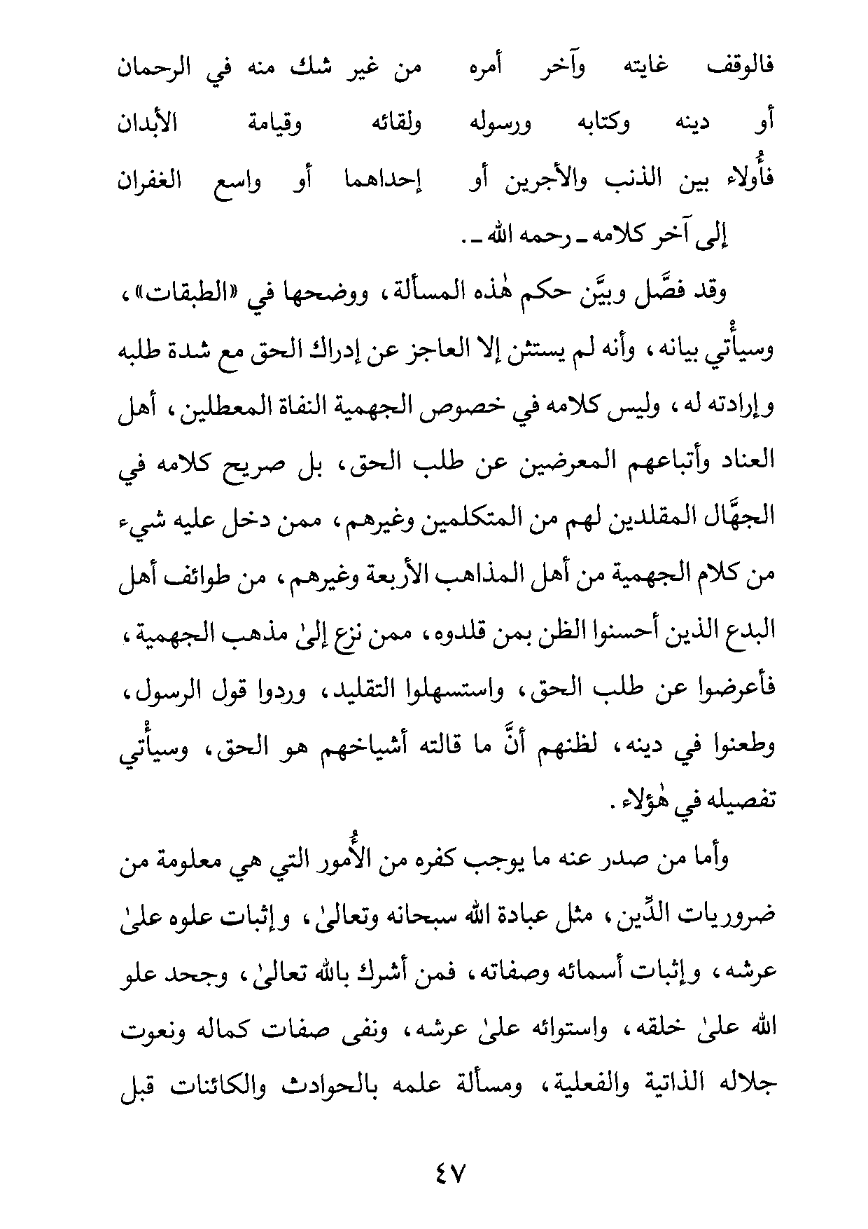 وَقد فصل وَبَين حكم هَذِه الْمَسْأَلَة ووضحها فِي الطَّبَقَات وَسَيَأْتِي بَيَانه وَأَنه لم يسْتَثْن إِلَّا الْعَاجِز عَن إِدْرَاك الْحق مَعَ شدَّة طلبه وإرادته لَهُ وَلَيْسَ كَلَامه فِي خُصُوص الْجَهْمِية النفاة المعطلين أهل العناد وأتباعهم المعرضين عَن طلب الْحق بل صَرِيح كَلَامه فِي الْجُهَّال المقلدين لَهُم من الْمُتَكَلِّمين وَغَيرهم مِمَّن دخل عَلَيْهِ شَيْء من كَلَام الْجَهْمِية من أهل الْمذَاهب الْأَرْبَعَة وَغَيرهم من طوائف أهل الْبدع الَّذين أَحْسنُوا الظَّن بِمن قلدوه مِمَّن نزع إِلَى مَذْهَب الْجَهْمِية فأعرضوا عَن طلب الْحق واستسهلوا التَّقْلِيد وردوا قَول الرَّسُول وطعنوا فِي دينه لظنهم أَن مَا قالته أَشْيَاخهم هُوَ الْحق وَسَيَأْتِي تَفْصِيله فِي هَؤُلَاءِ