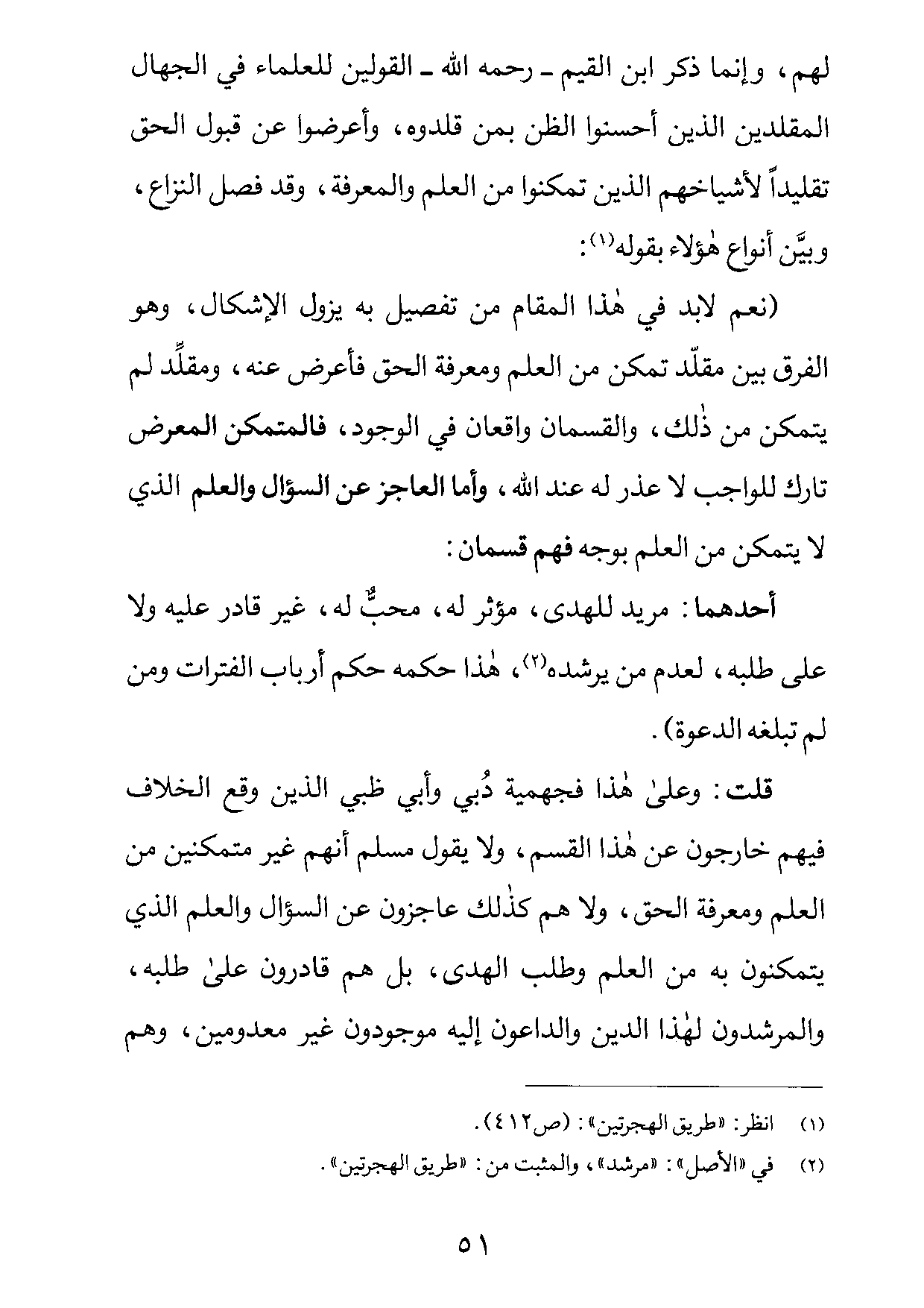 قلت وعَلى هَذَا فجهمية دبي وَأبي ظَبْي الَّذين وَقع الْخلاف فيهم خارجون عَن هَذَا الْقسم وَلَا يَقُول مُسلم أَنهم غير متمكنين من الْعلم وَمَعْرِفَة الْحق وَلَا هم كَذَلِك عاجزون عَن السُّؤَال وَالْعلم الَّذِي يتمكنون بِهِ من الْعلم وَطلب الْهدى بل هم قادرون على طلبه والمرشدون لهَذَا الدّين والداعون إِلَيْهِ موجودون غير معدومين وهم