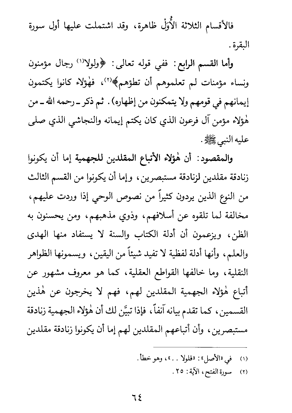 وَالْمَقْصُود أَن هَؤُلَاءِ الأتباع المقلدين للجهمية إِمَّا أَن يَكُونُوا زنادقة مقلدين لزنادقة مستبصرين وَإِمَّا أَن يَكُونُوا من الْقسم الثَّالِث من النَّوْع الَّذين يردون كثيرا من نُصُوص الْوَحْي إِذا وَردت عَلَيْهِم مُخَالفَة لما تلقوهُ عَن أسلافهم وَذَوي مَذْهَبهم وَمن يحسنون بِهِ الظَّن ويزعمون أَن أَدِلَّة الْكتاب وَالسّنة لَا يُسْتَفَاد مِنْهَا الْهدى وَالْعلم وَأَنَّهَا أَدِلَّة لفظية لَا تفِيد شَيْئا من الْيَقِين ويسمونها الظَّوَاهِر النقلية وَمَا خالفها القواطع الْعَقْلِيَّة كَمَا هُوَ مَعْرُوف مَشْهُور عَن أَتبَاع هَؤُلَاءِ الْجَهْمِية المقلدين لَهُم فهم لَا يخرجُون عَن هذَيْن الْقسمَيْنِ كَمَا تقدم بَيَانه آنِفا فَإِذا تبين لَك أَن هَؤُلَاءِ الْجَهْمِية زنادقة مستبصرين وَأَن أتباعهم المقلدين لَهُم إِمَّا أَن يَكُونُوا زنادقة مقلدين
