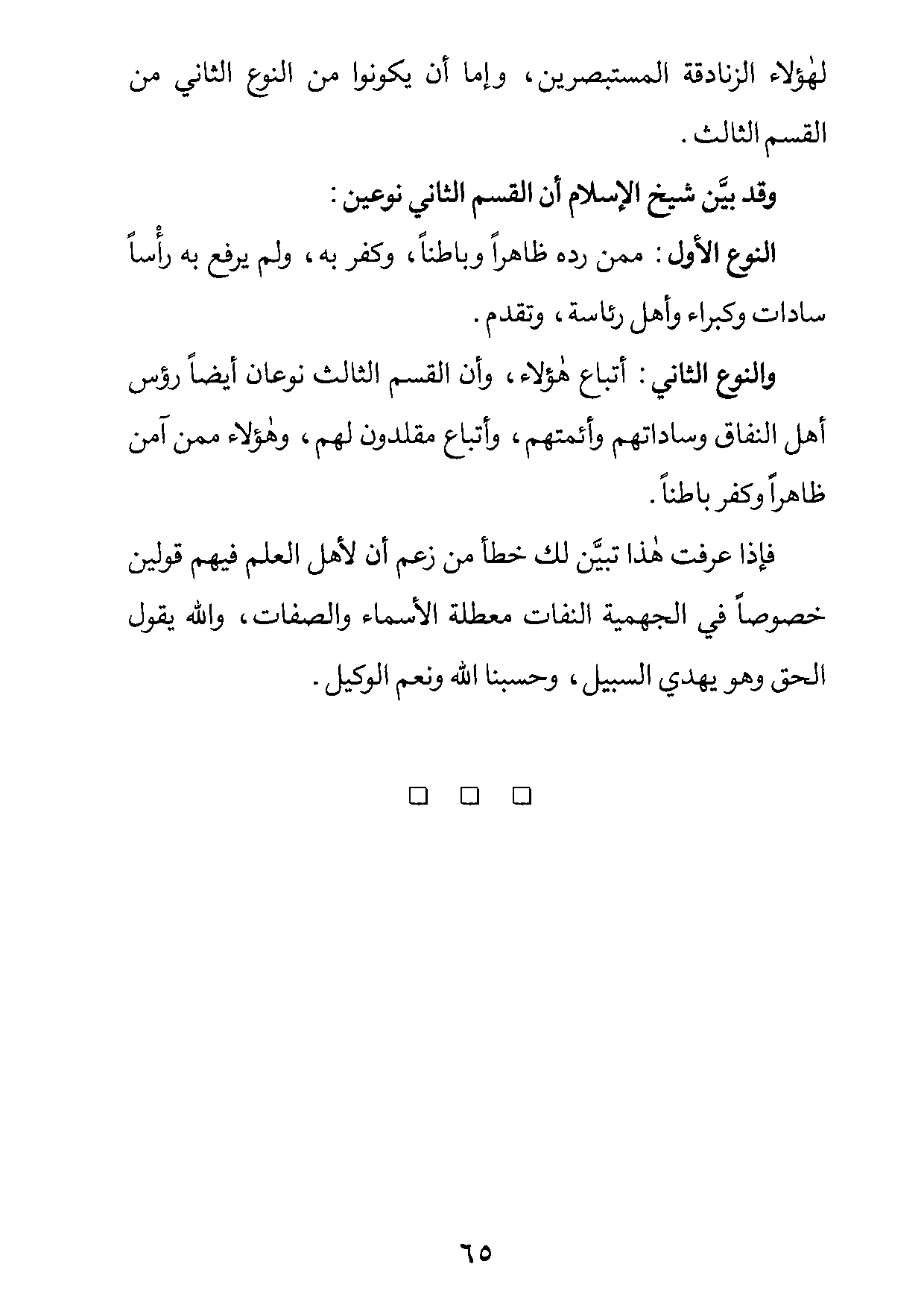 وَالنَّوْع الثَّانِي أَتبَاع هَؤُلَاءِ وَأَن الْقسم الثَّالِث نَوْعَانِ أَيْضا رُؤْس أهل النِّفَاق وساداتهم وأئمتهم وَأَتْبَاع مقلدون لَهُم وَهَؤُلَاء مِمَّن آمن ظَاهرا وَكفر بَاطِنا