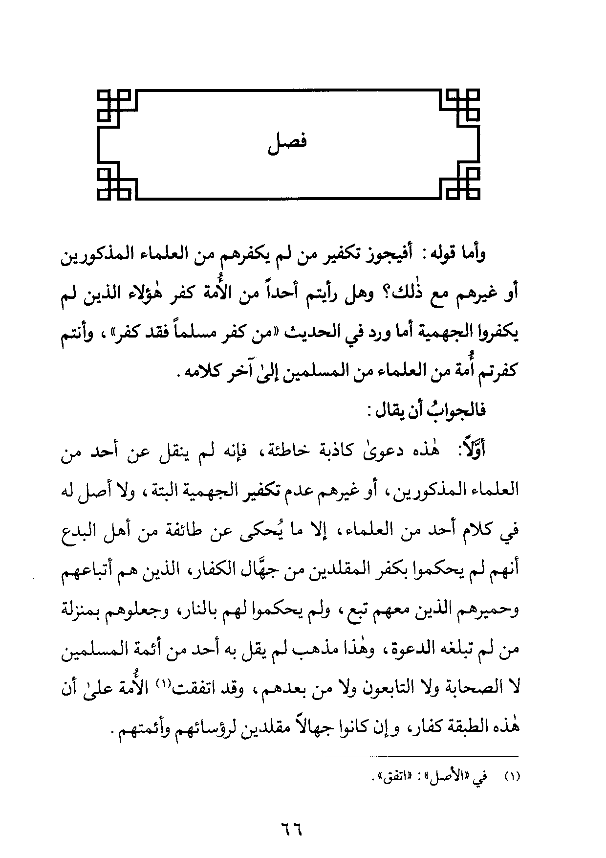 أَولا هَذِه دَعْوَى كَاذِبَة خاطئة فَإِنَّهُ لم ينْقل عَن أحد من الْعلمَاء الْمَذْكُورين أَو غَيرهم عدم تَكْفِير الْجَهْمِية الْبَتَّةَ وَلَا أصل لَهُ فِي كَلَام أحد من الْعلمَاء إِلَّا مَا يحْكى عَن طَائِفَة من أهل الْبدع أَنهم لم يحكموا بِكفْر المقلدين من جهال الْكفَّار الَّذين هم أتباعهم وحميرهم الَّذين مَعَهم تبع وَلم يحكموا لَهُم بالنَّار وجعلوهم بِمَنْزِلَة من لم تبلغه الدعْوَة وَهَذَا مَذْهَب لم يقل بِهِ أحد من أَئِمَّة الْمُسلمين لَا الصَّحَابَة وَلَا التابعون وَلَا من بعدهمْ وَقد اتّفقت الْأمة على أَن هَذِه الطَّبَقَة كفار وَإِن كَانُوا جُهَّالًا مقلدين لرؤسائهم وأئمتهم