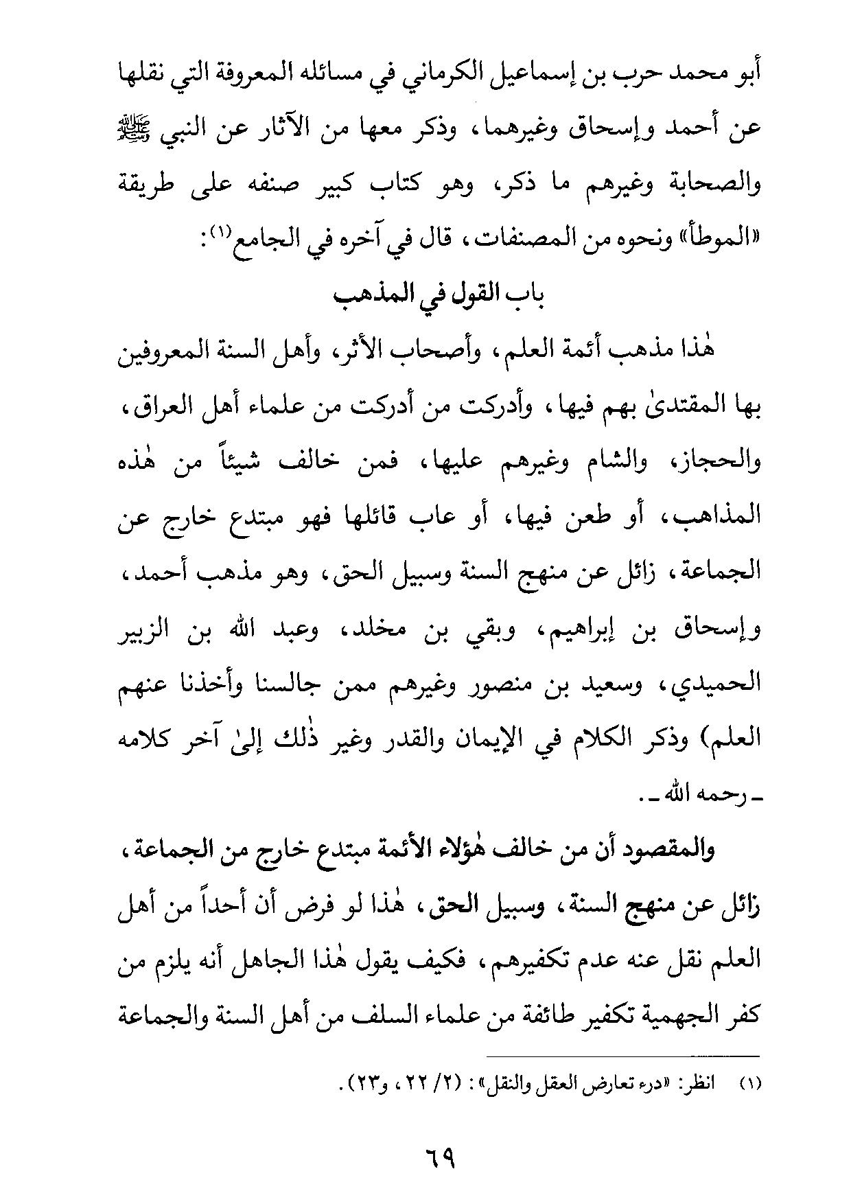 أَبُو مُحَمَّد حَرْب بن إِسْمَاعِيل الْكرْمَانِي فِي مسَائِله الْمَعْرُوفَة الَّتِي نقلهَا عَن أَحْمد وَإِسْحَاق وَغَيرهمَا وَذكر مَعهَا من الْآثَار عَن النَّبِي صلى الله عَلَيْهِ وَسلم وَالصَّحَابَة وَغَيرهم مَا ذكر وَهُوَ كتاب كَبِير صنفه على طَريقَة الْمُوَطَّأ وَنَحْوه من المصنفات قَالَ فِي آخِره فِي الْجَامِع