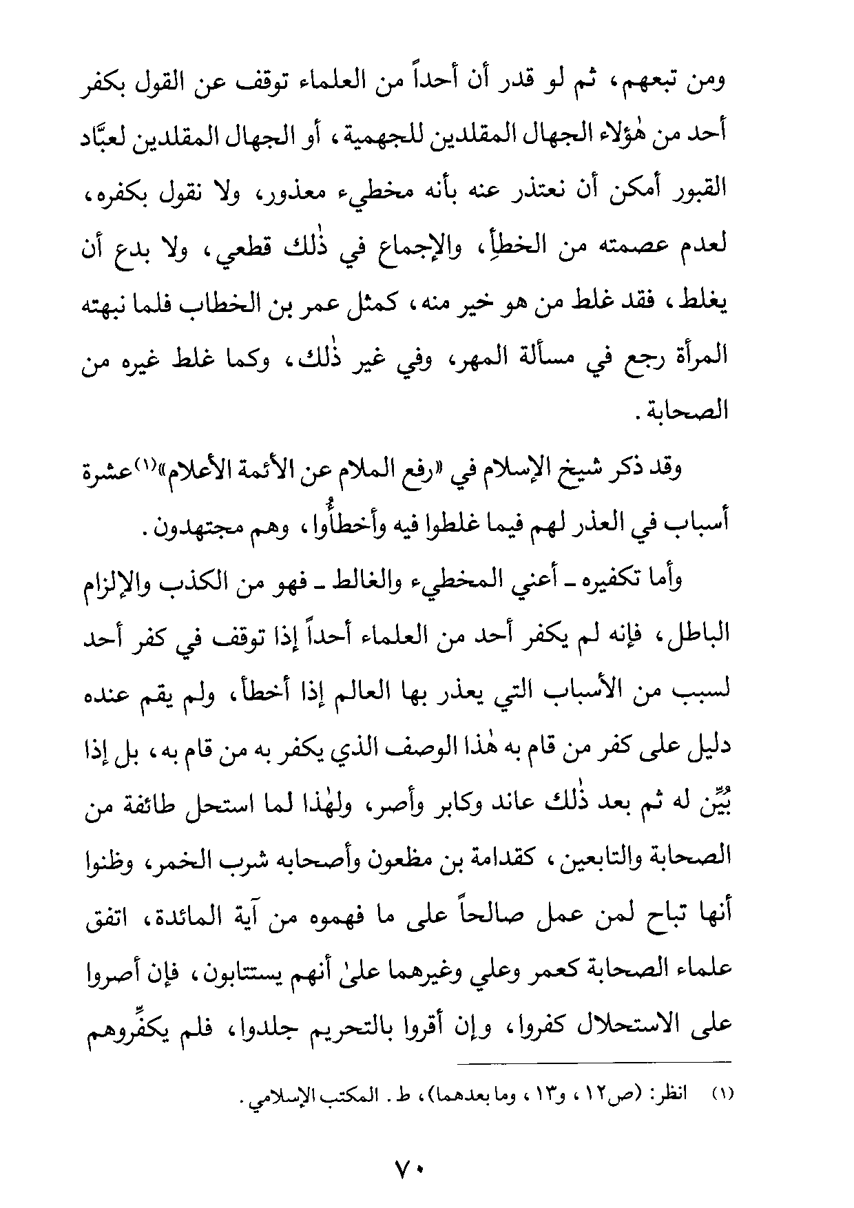وَمن تَبِعَهُمْ ثمَّ لَو قدر أَن أحدا من الْعلمَاء توقف عَن القَوْل بِكفْر أحد من هَؤُلَاءِ الْجُهَّال المقلدين للجهمية أَو الْجُهَّال المقلدين لعباد الْقُبُور أمكن أَن نعتذر عَنهُ بِأَنَّهُ مخطيء مَعْذُور وَلَا نقُول بِكُفْرِهِ لعدم عصمته من الْخَطَأ وَالْإِجْمَاع فِي ذَلِك قَطْعِيّ وَلَا بدع أَن يغلط فقد غلط من هُوَ خير مِنْهُ كَمثل عمر بن الْخطاب فَلَمَّا نبهته الْمَرْأَة رَجَعَ فِي مَسْأَلَة الْمهْر وَفِي غير ذَلِك وكما غلط غَيره من الصَّحَابَة