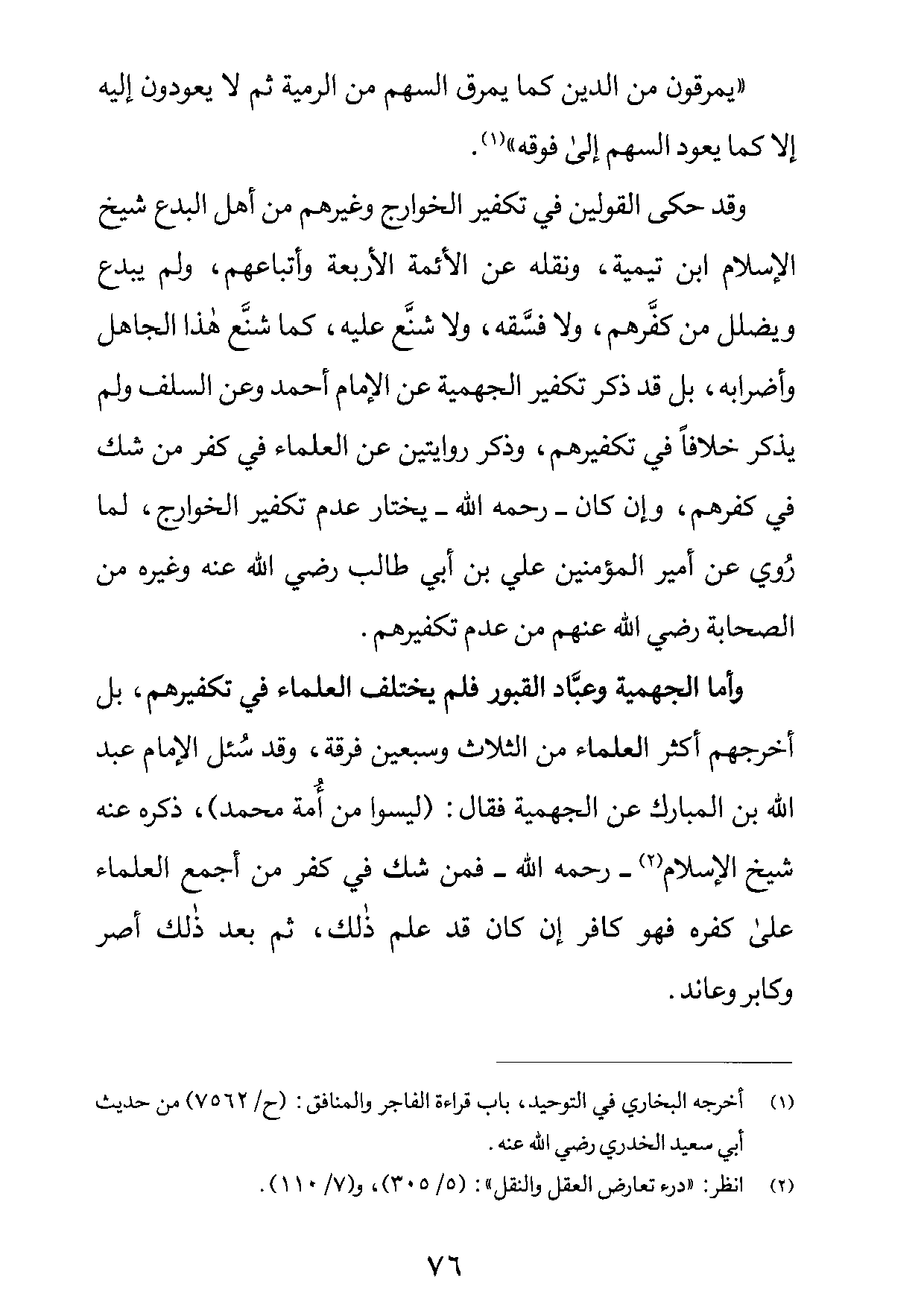 وَقد حكى الْقَوْلَيْنِ فِي تَكْفِير الْخَوَارِج وَغَيرهم من أهل الْبدع شيخ الْإِسْلَام ابْن تَيْمِية وَنَقله عَن الْأَئِمَّة الْأَرْبَعَة وأتباعهم وَلم يبدع ويضلل من كفرهم وَلَا فسقه وَلَا شنع عَلَيْهِ كَمَا شنع هَذَا الْجَاهِل وَأَضْرَابه بل قد ذكر تَكْفِير الْجَهْمِية عَن الإِمَام أَحْمد وَعَن السّلف وَلم يذكر خلافًا فِي تكفيرهم وَذكر رِوَايَتَيْنِ عَن الْعلمَاء فِي كفر من شكّ فِي كفرهم وَإِن كَانَ رَحمَه الله يخْتَار عدم تَكْفِير الْخَوَارِج لما رُوِيَ عَن أَمِير الْمُؤمنِينَ عَليّ بن أبي طَالب رَضِي الله عَنهُ وَغَيره من الصَّحَابَة رَضِي الله عَنْهُم من عدم تكفيرهم