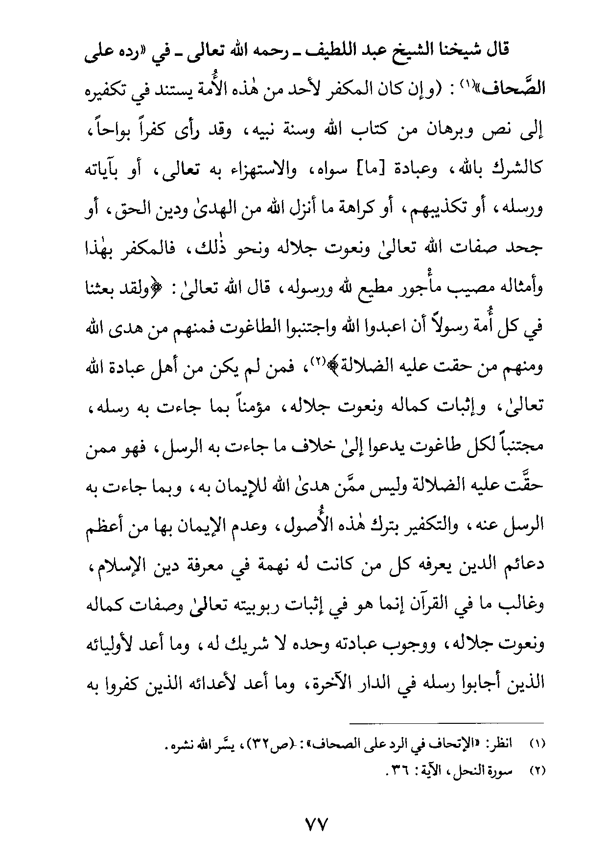 قَالَ شَيخنَا الشَّيْخ عبد اللَّطِيف رَحمَه الله تَعَالَى فِي رده على الصحاف وَإِن كَانَ الْمُكَفّر لأحد من هَذِه الْأمة يسْتَند فِي تكفيره إِلَى نَص وبرهان من كتاب الله وَسنة نبيه وَقد رأى كفرا بواحا كالشرك بِاللَّه وَعبادَة مَا سواهُ والاستهزاء بِهِ تَعَالَى أَو بآياته وَرُسُله أَو تكذيبهم أَو كَرَاهَة مَا أنزل الله من الْهدى وَدين الْحق أَو جحد صِفَات الله تَعَالَى ونعوت جَلَاله وَنَحْو ذَلِك فالمكفر بِهَذَا وَأَمْثَاله مُصِيب مأجور مُطِيع لله وَرَسُوله قَالَ الله تَعَالَى {وَلَقَد بعثنَا فِي كل أمة رَسُولا أَن اعبدوا الله وَاجْتَنبُوا الطاغوت فَمنهمْ من هدى الله وَمِنْهُم من حقت عَلَيْهِ الضَّلَالَة} فَمن لم يكن من أهل عبَادَة الله تَعَالَى وَإِثْبَات كَمَاله ونعوت جَلَاله مُؤمنا بِمَا جَاءَت بِهِ رسله مجتنبا لكل طاغوت يدعوا إِلَى خلاف مَا جَاءَت بِهِ الرُّسُل فَهُوَ مِمَّن حقت عَلَيْهِ الضَّلَالَة وَلَيْسَ مِمَّن هدى الله للْإيمَان بِهِ وَبِمَا جَاءَت بِهِ الرُّسُل عَنهُ والتكفير بترك هَذِه الْأُصُول وَعدم الْإِيمَان بهَا من أعظم دعائم الدّين يعرفهُ كل من كَانَت لَهُ نهمة فِي معرفَة دين الْإِسْلَام وغالب مَا فِي الْقُرْآن إِنَّمَا هُوَ فِي إِثْبَات ربوبيته تَعَالَى وصفات كَمَاله ونعوت جَلَاله وَوُجُوب عِبَادَته وَحده لَا شريك لَهُ وَمَا أعد لأوليائه الَّذين أجابوا رسله فِي الدَّار الْآخِرَة وَمَا أعد لأعدائه الَّذين كفرُوا بِهِ