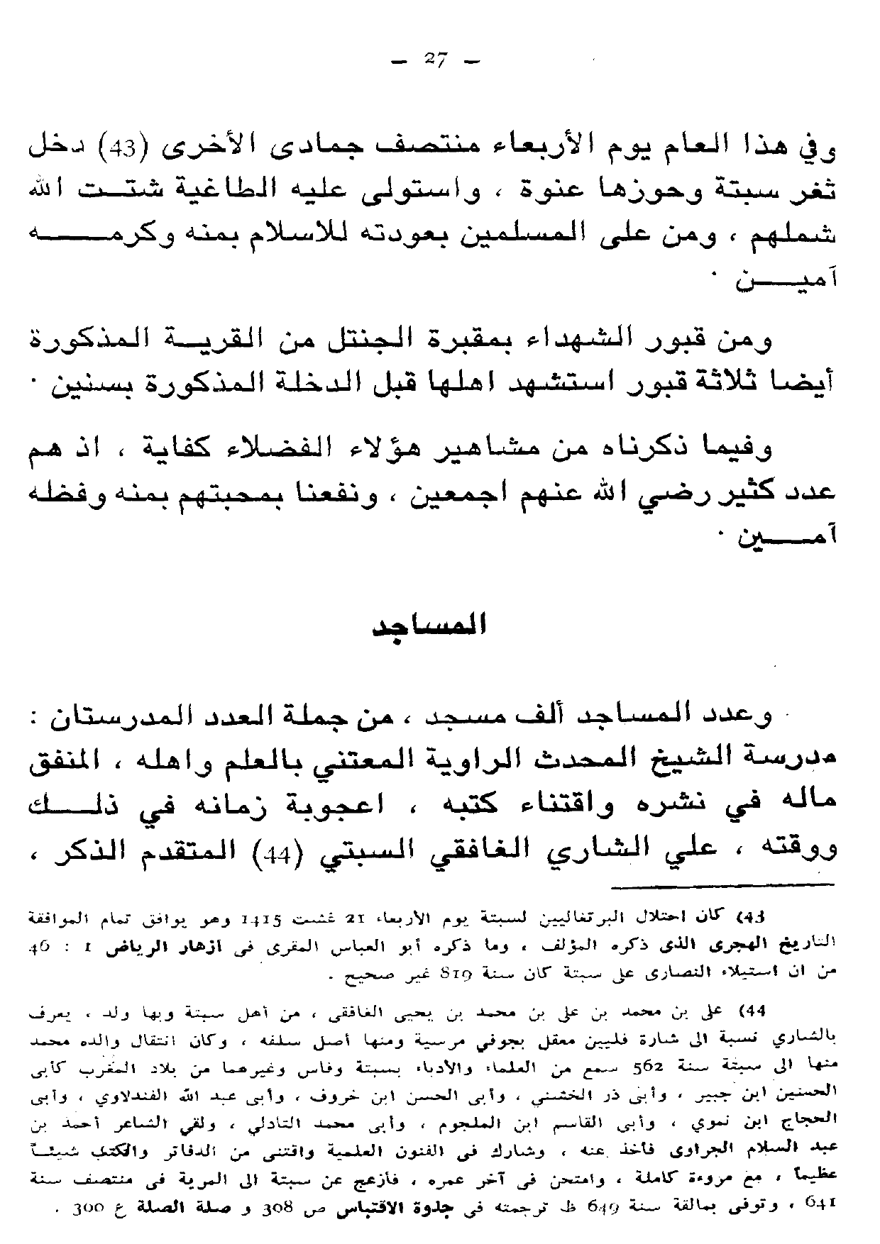 وفي هذا العام يوم الأربعاء منتصف جمادى الأخرى دخل ثغر سبتة وحوزها عنوة، واستولى عليه الطاغية شتت الله شملهم، ومن على المسلمين بعودته للإسلام بمنه وكرمه آمين.
