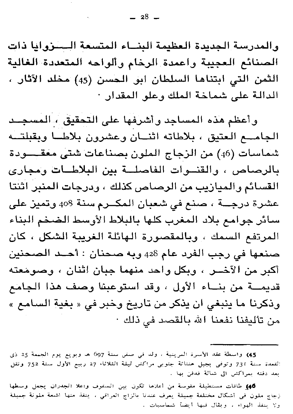 والمدرسة الجديدة العظيمة البناء المتسعة الزوايا ذات الصنائع العجيبة وأعمدة الرخام وألواحه المتعددة الغالية الثمن التي ابتناها السلطان أبو الحسن مخلد الآثار، الدالة على شماخة الملك وعلو المقدار.
