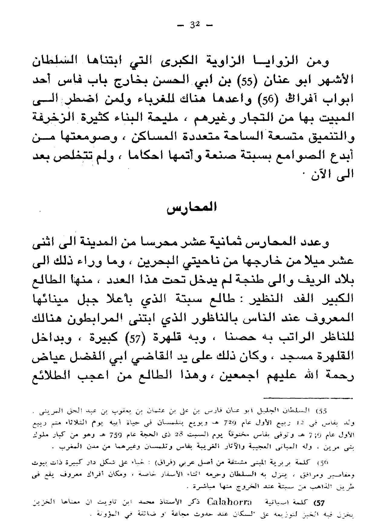 من ناحيتي البحرين، وما وراء ذلك إلى بلاد الريف وإلى طنجة ولم يدخل تحت هذا العدد، منها الطالع الكبير الفذ النظير: طالع سبتة الذي بأعلا جبل ميناءها المعروف عند الناس بالناظور الذي ابتنى المرابطون هنالك للناظر الراتب به حصناً، وبه قلهرة كبيرة، وبداخل القلهرة مسجد، وكان ذلك على يد القاضي أبي الفضل عياض رحمة الله عليهم أجمعين، وهذا الطالع من أعجب الطلائع