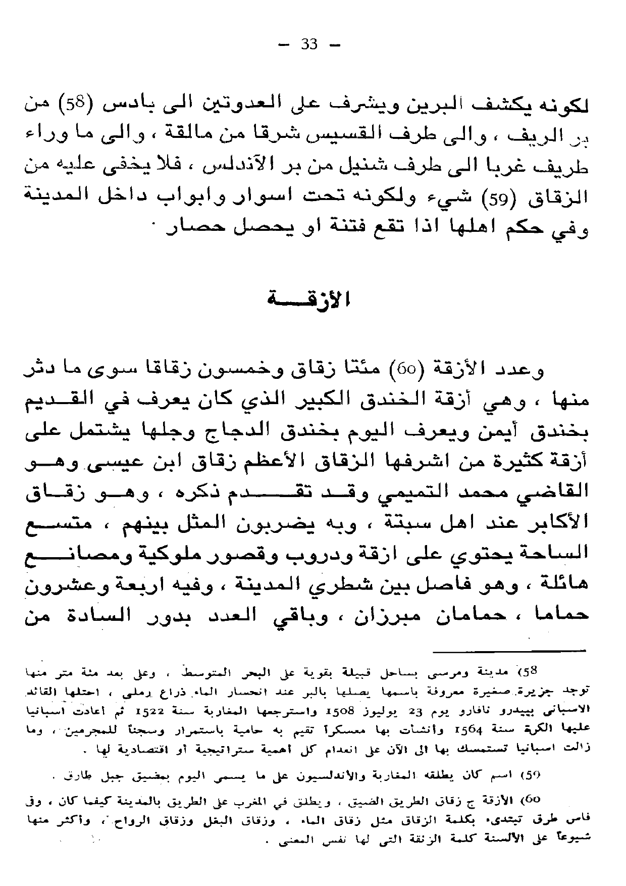 وعدد الأزقة مائتا زقاق وخمسون زقاقاً سوى ما دثر منها، وهي أزقة الخندق الكبير الذي كان يعرف في القديم بخندق أيمن ويعرف اليوم بخندق الدجاج وجلها يشتمل على أزقة كثيرة من أشرفها الزقاق الأعظم زقاق ابن عيسى وهو القاضي محمد التميمي وقد تقدم ذكره، وهو زقاق الأكابر عند أهل سبتة، وبه يضربون المثل بينهم، متسع الساحة يحتوي على أزقة ودروب وقصور ملوكية ومصانع هائلة، وهو فاصل بين شطري المدينة، وفيه أربعة وعشرون حماماً، حمامان مبرزان، وباقي العدد بدور السادة من