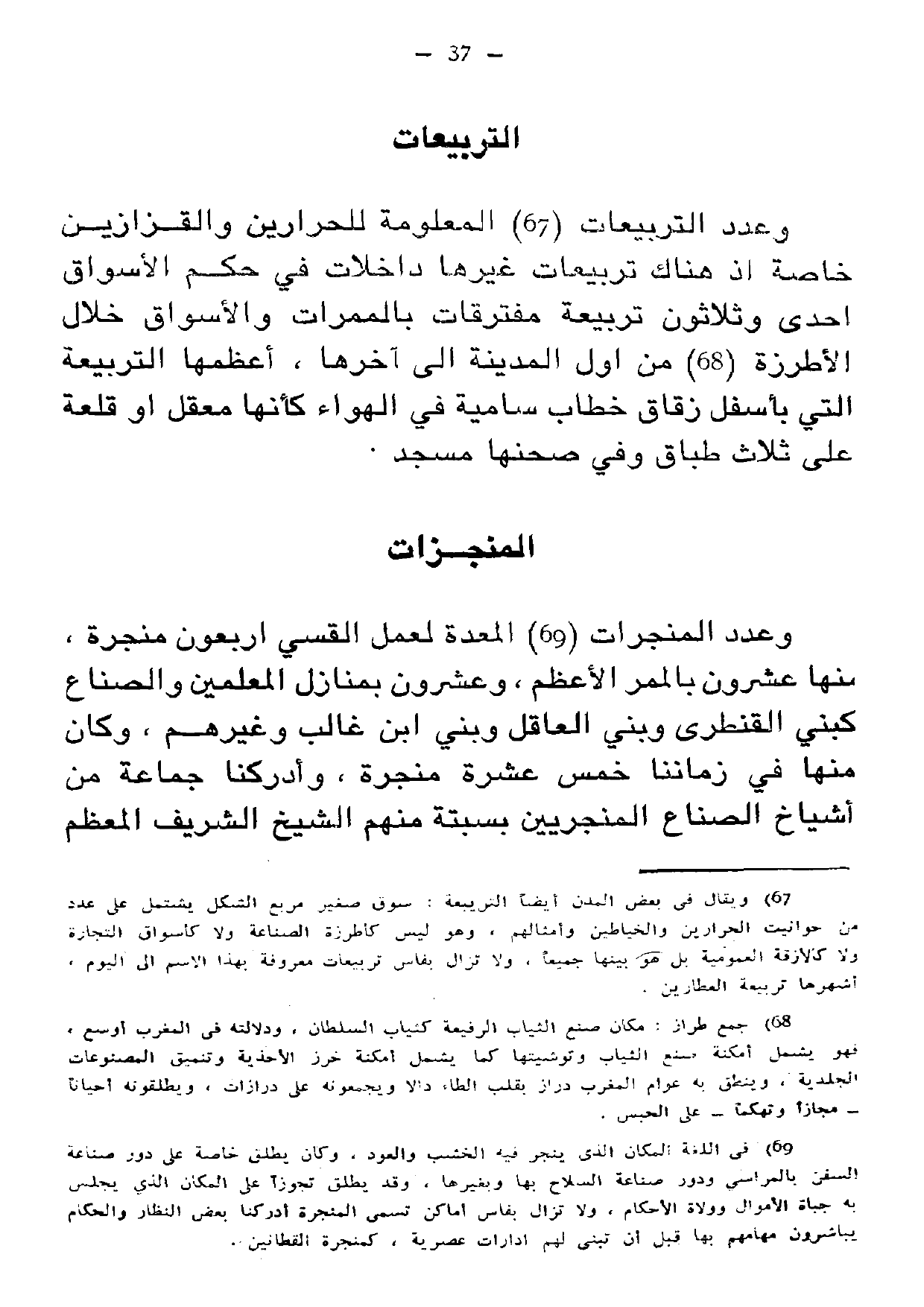 وعدد التربيعات المعلومة للحرارين والقزازين خاصة إذ هناك تربيعات غيرها داخلات في حكم الأسواق إحدى وثلاثون تربيعة مفترقات بالممرات والأسواق خلال الأطرزة من أول المدينة إلى آخرها، أعظمها التربيعة التي بأسفل زقاق خطاب سامية في الهواء كأنها معقل أو قلعة على ثلاث طباق وفي صحنها مسجد.