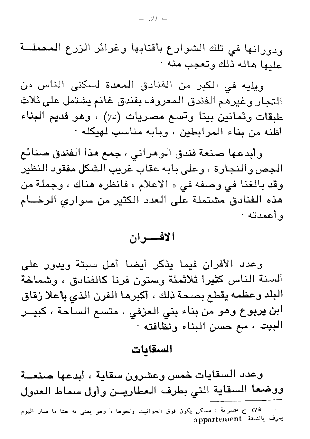 ودورانها في تلك الشوارع بأقتابها وغرائر الزرع المحملة عليها هاله ذلك وتعجب منه. ويليه في الكبر من الفنادق المعدة لسكنى الناس من التجار وغيرهم الفندق المعروف بفندق غانم يشتمل على ثلاث طبقات وثمانين بيتاً وتسع مصريات، وهو قديم البناء أظنه من بناء المرابطين، وبابه