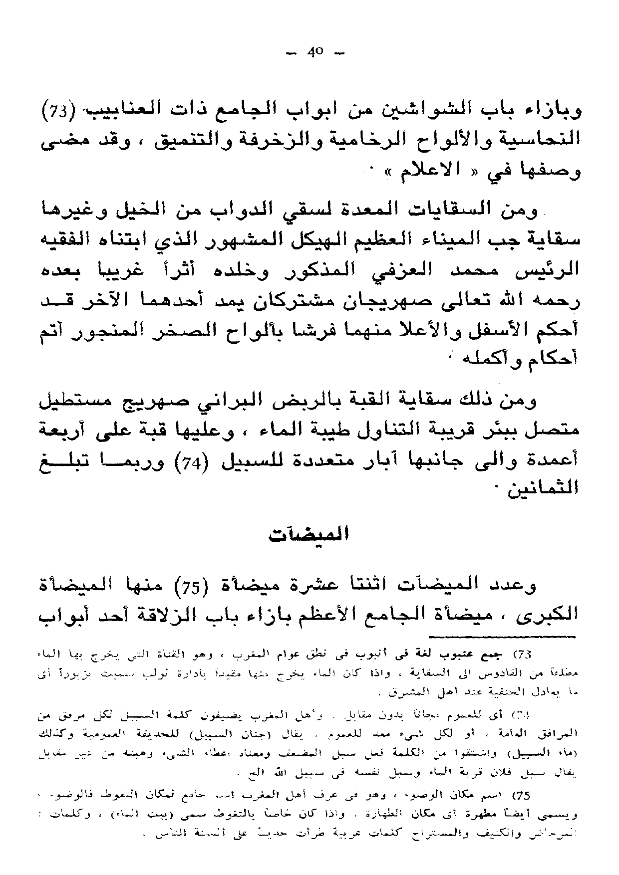 ومن السقايات المعدة لسقي الدواب من الخيل وغيرها سقاية جب الميناء العظيم الهيكل المشهور الذي ابتناه الفقيه الرئيس محمد العزفي المذكور وخلده أثراً غريباً بعده رحمه الله تعالى صهريجان مشتركان يمد أحدهما الآخر قد أحكم الأسفل والأعلى منهما فرشاً بألواح الصخر المنجور أتم إحكام وأكمله.