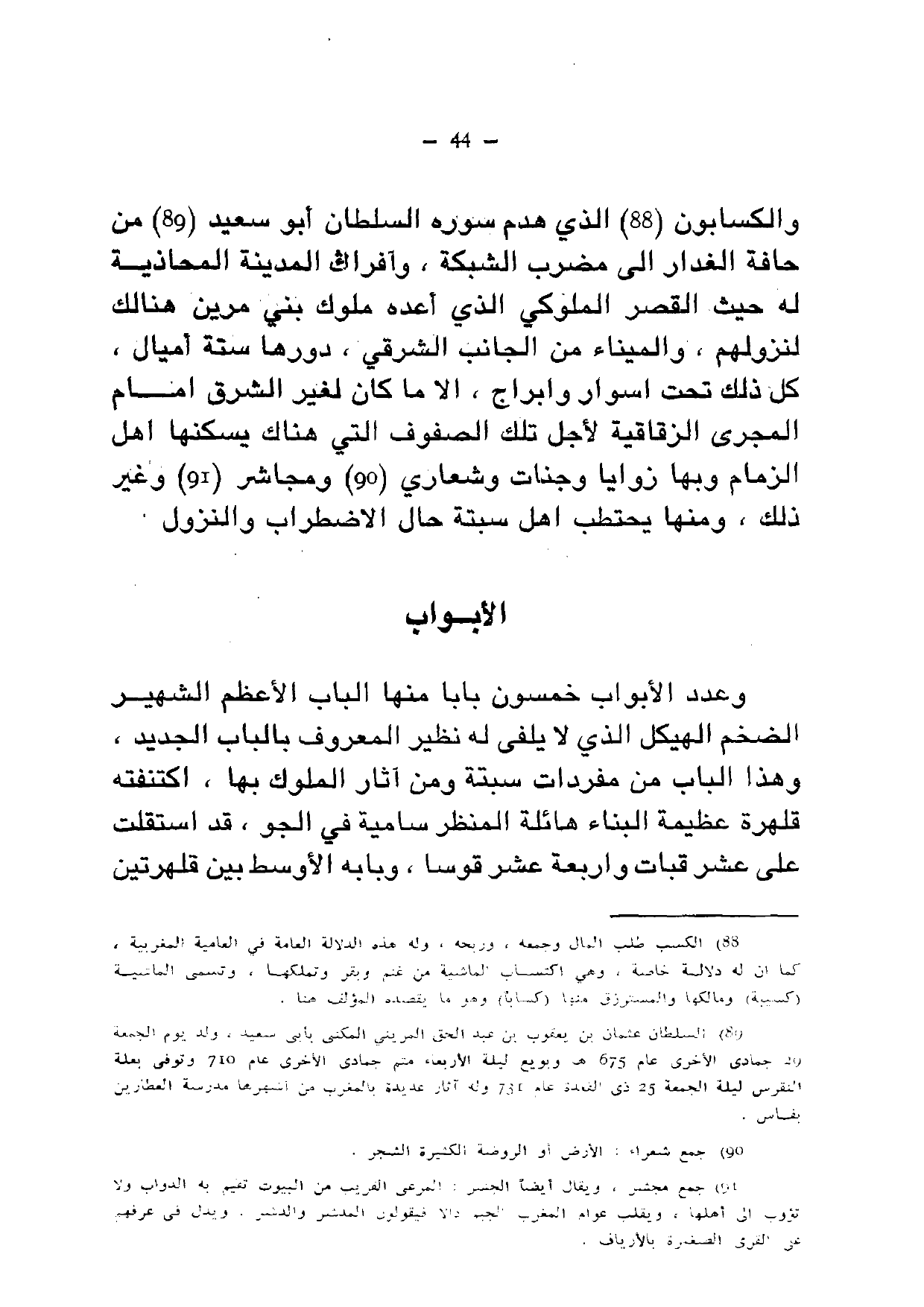 والكسابون الذي هدم سوره السلطان أبو سعيد من حافة الغدار إلى مضرب الشبكة، وأفراك المدينة المحاذية له حيث القصر الملوكي الذي أعده ملوك بني مرين هنالك لنزولهم، والميناء من الجانب الشرقي، دورها ستة أميال، كل ذلك تحت أسوار وأبراج، إلا ما كان لغير الشرق أمام المجرى الزقاقية لأجل تلك الصفوف التي هناك يسكنها أهل الزمام وبها زوايا وجنات وشعاري ومجاشر وغير ذلك، ومنها يحتطب أهل سبتة حال الاضطراب والنزول.