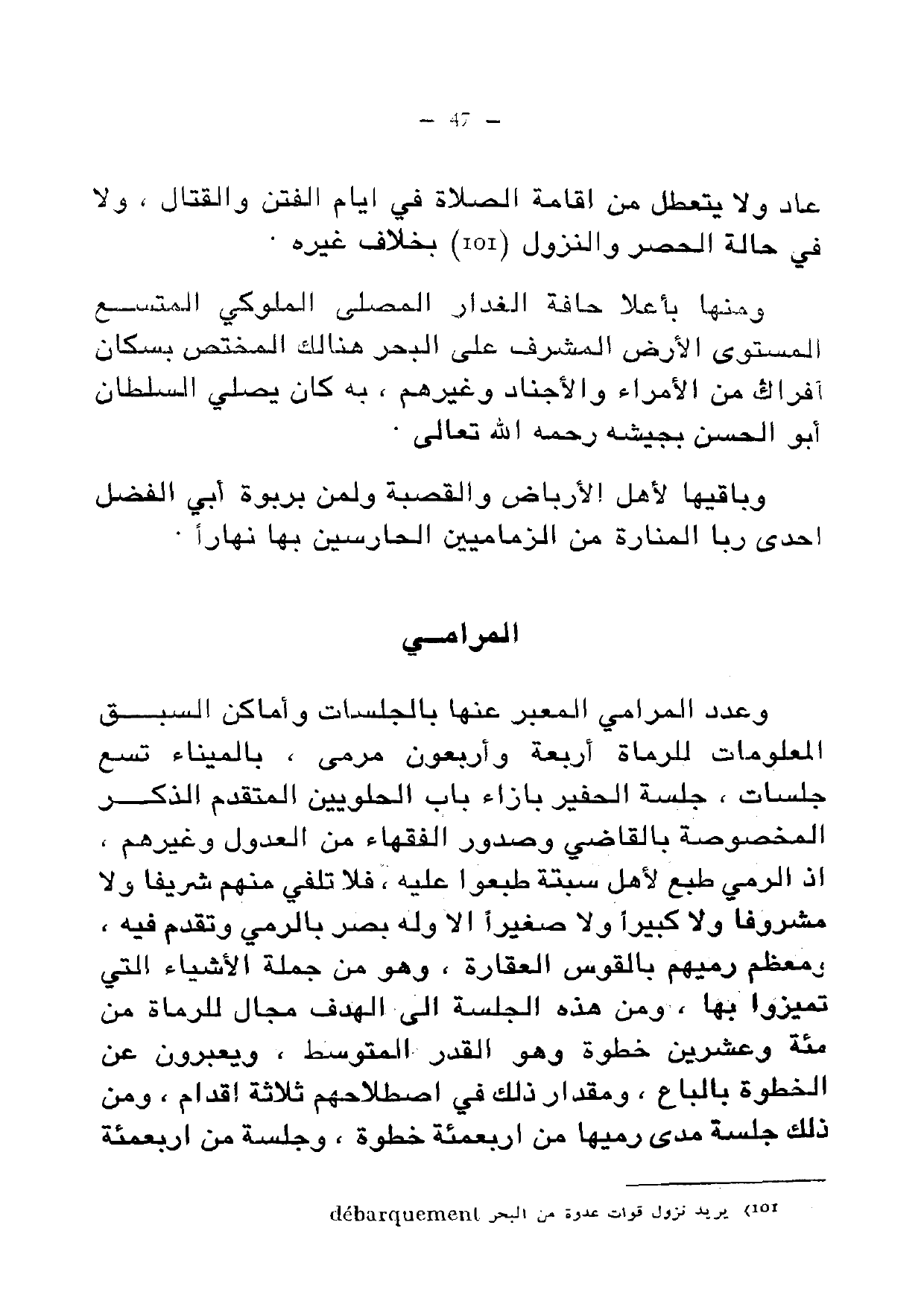 ومنها بأعلى حافة الغدار المصلى الملوكي المتسع المستوي الأرض المشرف على البحر هناك المختص بسكان أفراك من الأمراء والأجناد وغيرهم، به كان يصلي السلطان أبو الحسن بجيشه رحمه الله تعالى.