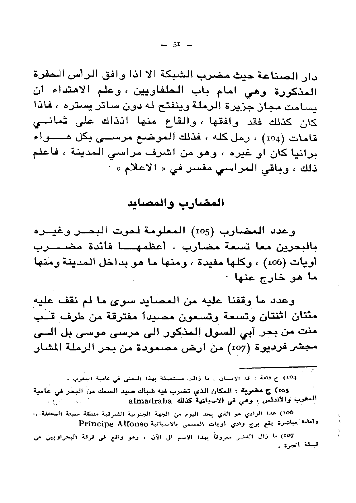 دار الصناعة حيث مضرب الشبكة إلا إذا وافق الرأس الحفرة المذكورة وهي أمام باب الحلفاويين، وعلم الاهتداء أن يسامت مجاز جزيرة الرملة وينفتح له دون ساتر يستره، فإذا كان كذلك فقد وافقها، والقاع منها إذ ذاك على ثماني قامات، رمل كله، فذلك الموضع مرسي بكل هواء برانيا كان أو غيره، وهو من أشرف مراسي المدينة، فاعلم ذلك، وباقي المراسي مفسر في (الأعلام).