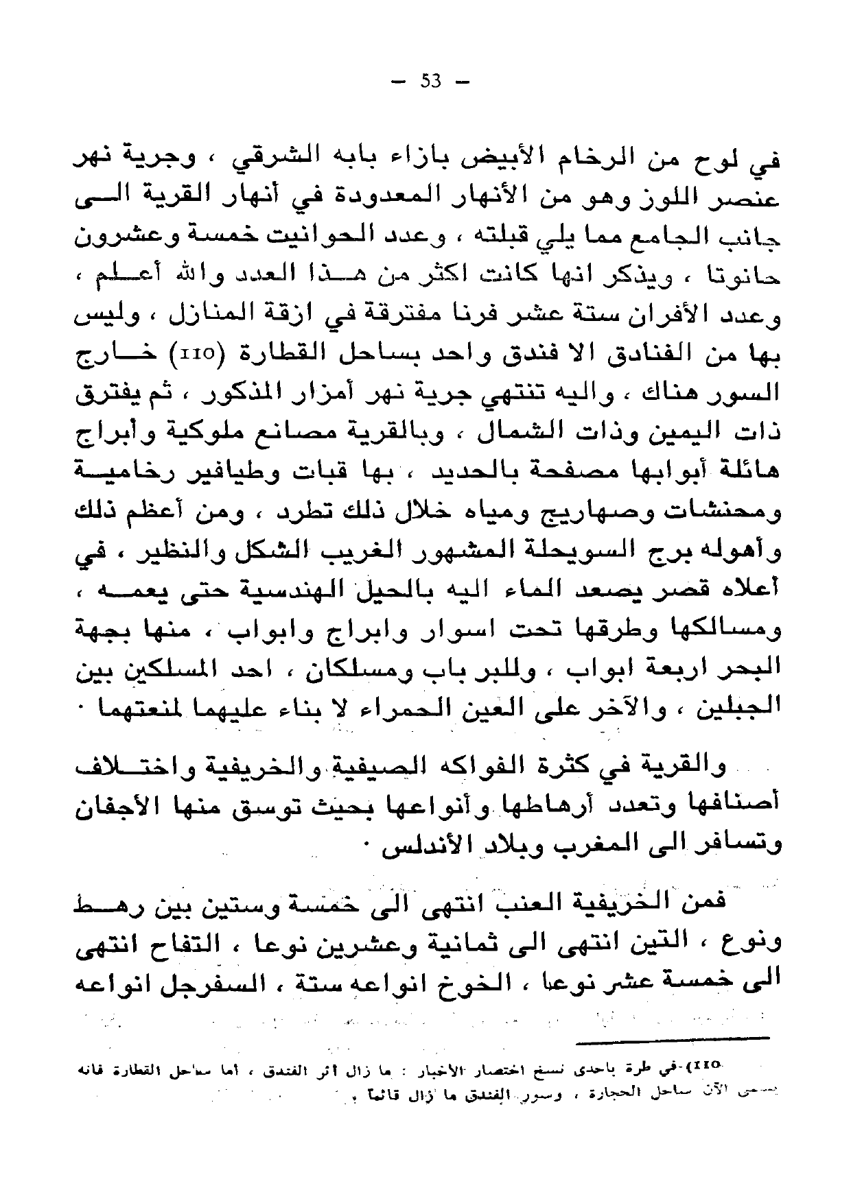 والقرية في كثرة الفواكه الصيفية والخريفية واختلاف أصنافها وتعدد أرهاطها وأنواعها بحيث توسق منها الأجفان وتسافر إلى المغرب وبلاد الأندلس.
