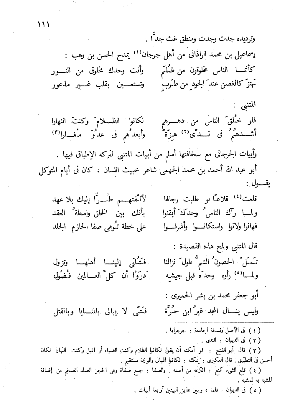 وأبيات الجرجاني مع سخافتها أسلم من أبيات المتنبي لتركه الإطباق فيها.