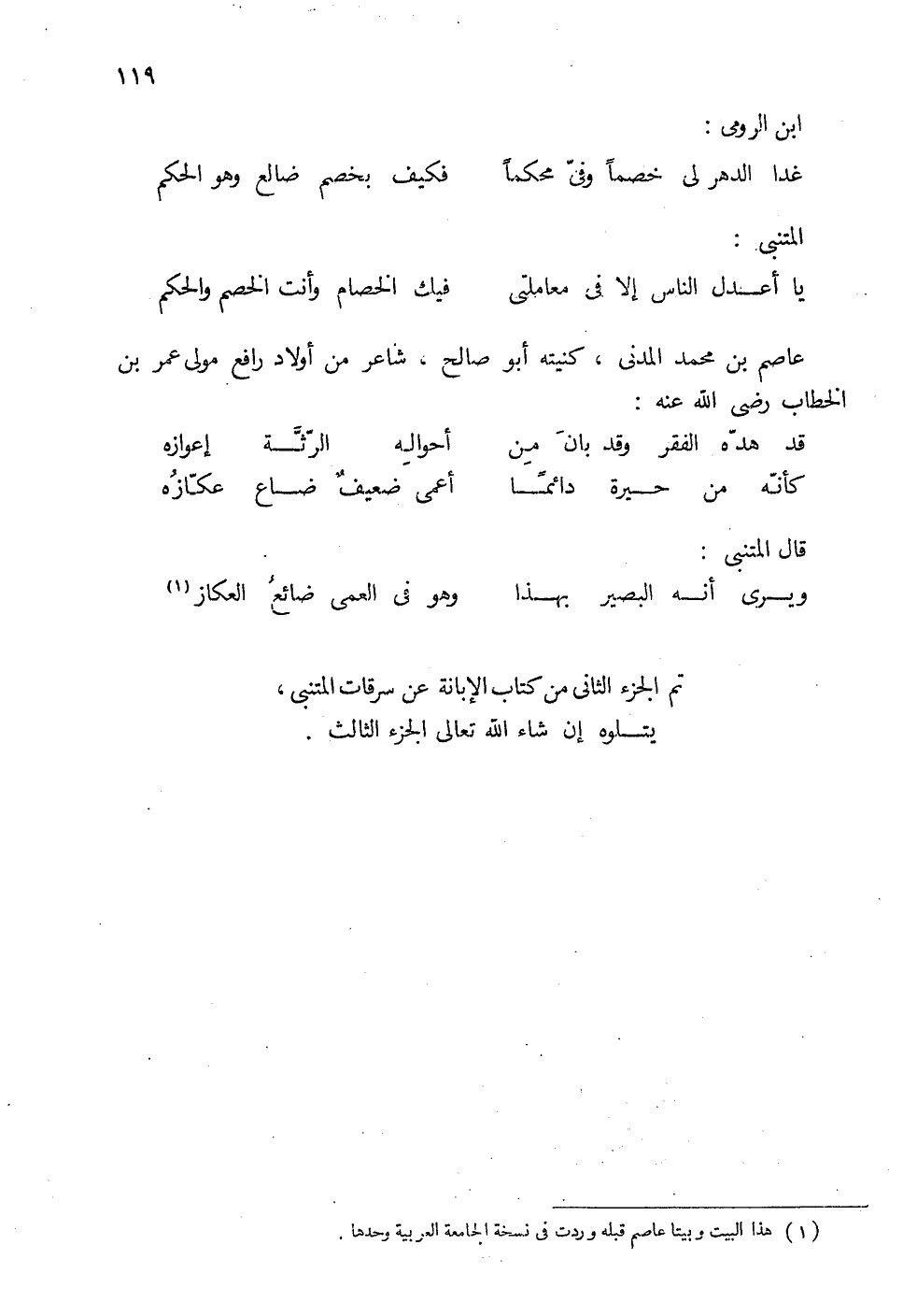 تم الجزء الثاني من كتاب الإبانة عن سرقات المتنبي، يتلوه إن شاء الله تعالى الجزء الثالث.