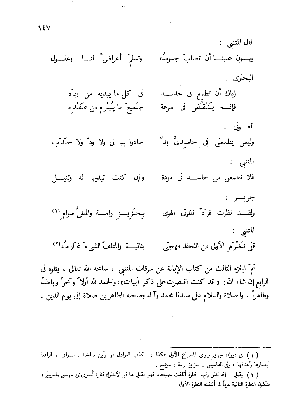 تمّ الجزء الثالث من كتاب الإبانة عن سرقات المتنبي، سامحه الله تعالى، يتلوه في الرابع إن شاء الله: (قد كنت اقتصرت على ذكر أبيات)، والحمد لله أولاً وآخراً وباطناً وظاهراً، والصلاة والسلام على سيدنا محمد وآله وصحبه الطاهرين صلاة