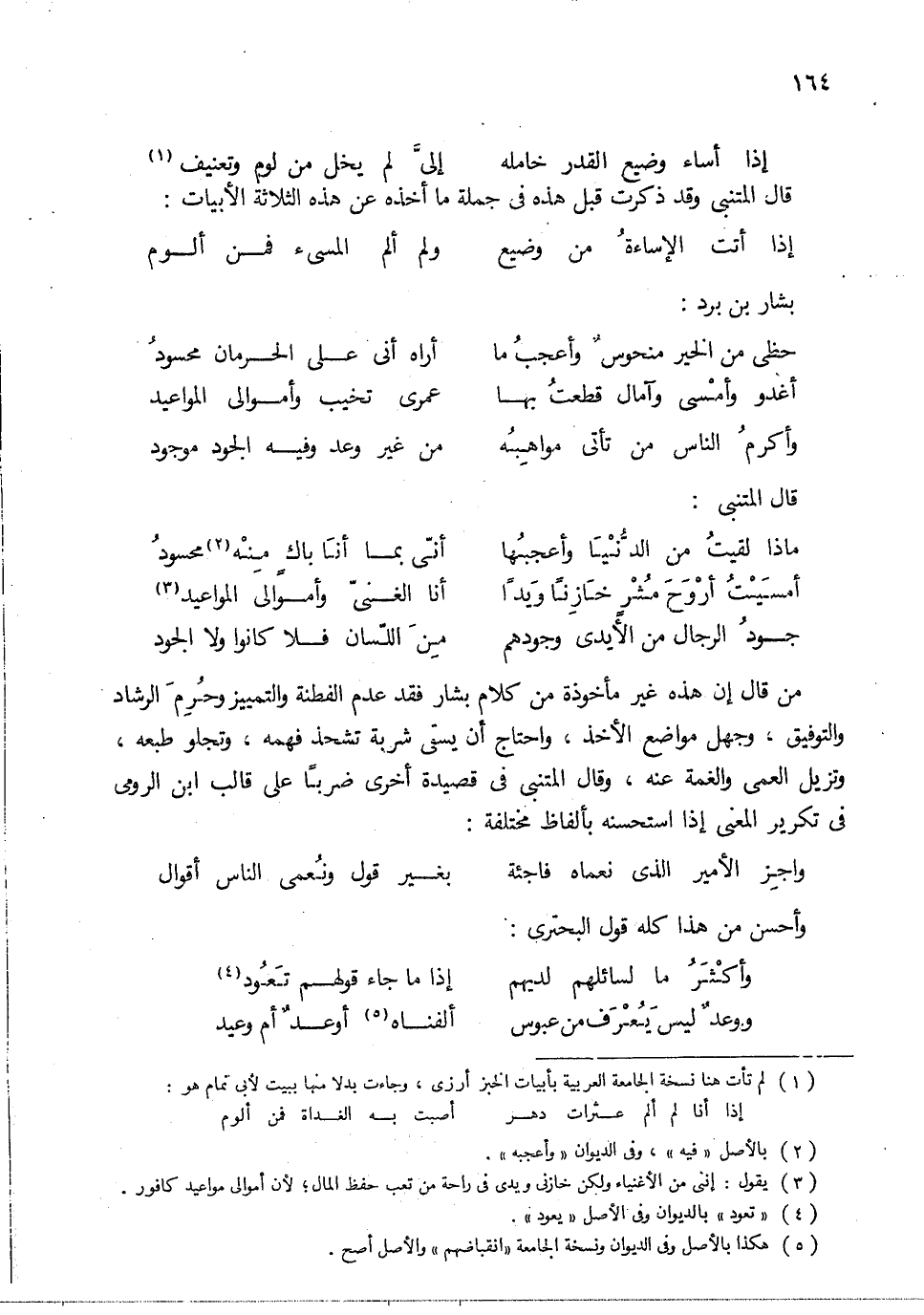 والتوفيق، وجهل مواضع الأخذ، وأحتاج أن يسقى شربة تشحذ فهمه، وتجلو طبعه، وتزيل العمى والغمة عنه، وقال المتنبي في قصيدة أخرى ضرباً على قالب ابن الرومي في تكرير المعنى إذا أستحسنه بألفاظ مختلفة: