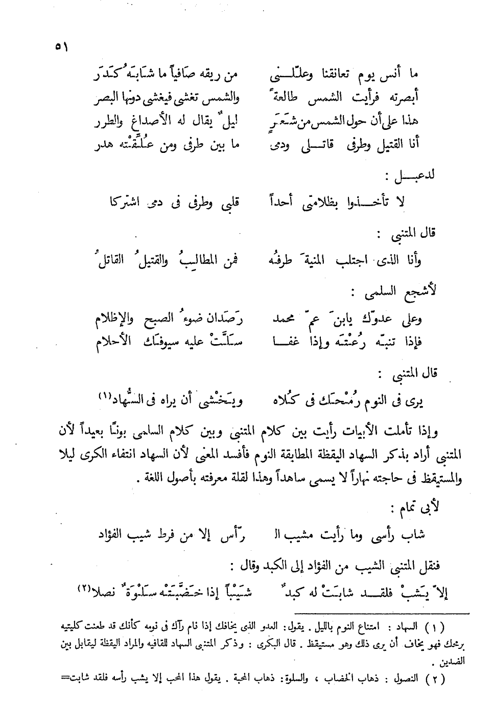 وإذا تأملت الأبيات رأيت بين كلام المتنبي وبين كلام السلمي بوناً بعيداً لأن المتنبي أراد بذكر السهاد اليقظة المطابقة النوم فأفسد المعنى لأن السهاد انتفاء الكرى ليلاً والمستيقظ في حاجته نهاراً لا يسمى ساهداً وهذا لقلة معرفته بأصول اللغة.