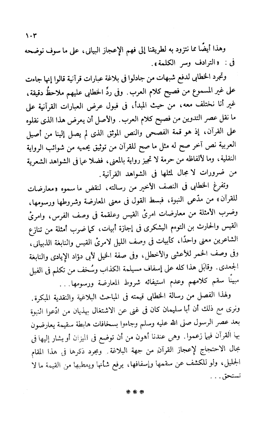ولهذا الفصل من رسالة الخطابي قيمته في المباحث البلاغية والنقدية المبكرة. ونرى مع ذلك أن أبا سليمان كان في غنى عن الاشتغال بهذيان من ادّعوا النبوة بعد عصر الرسول - صلى الله عليه وسلم - وجاءوا بسخافات هابطة سقيمة يعارضون بها القرآن فيما زعموا. وهي عندنا أهون من أن توضع في الميزان أو يشار إليها في مجال الاحتجاج لإعجاز القرآن من جهة البلاغة. ومجرد ذكرها في هذا المقام الجليل، ولو للكشف عن سقمها وإسفافها، يرفع شأنها ويعطيها من القيمة ما لا تستحق. . .