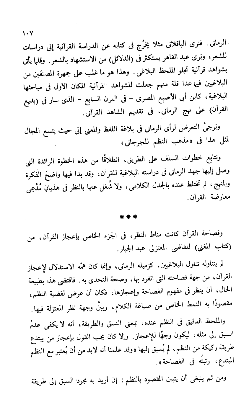 ونتابع خطوات السلف على الطريق، انطلاقاً من هذه الخطوة الرائدة التي وصل إليها جهد الرماني في دراسته البلاغية للقرآن، وقد بدا واضح الفكرة والمنهج، لم تختلط عنده بالجدل الكلامي، ولا شُغل عنها بالنظر في هذيانِ مُدَّعِى معارضة القرآن.