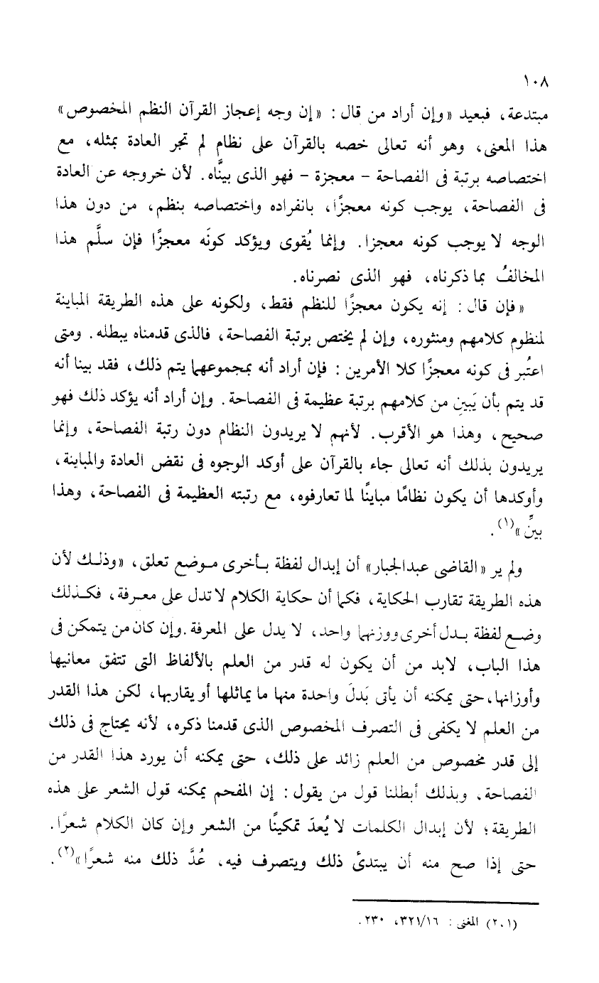 "فإن قال: إنه يكون معجزاً للنظم فقط، ولكونه على هذه الطريقة المباينة لمنظوم كلامهم ومنثورة، وإن لم يختص برتبة الفصاحة، فالذي قدمناه يبطله. ومتى اعتُبر في كونه معجزاً كلا الأمرين: فإن أراد أنه بمجموعهما يتم ذلك، فقد بينا أنه قد يتم بأن يَبيِن من كلامهم برتبة عظيمة في الفصاحة. وإن أراد أنه يؤكد ذلك فهو صحيح، وهذا هو الأقرب. لأنهم لا يريدون النظام دون رتبة الفصاحة، وإنما يريدون بذلك أنه تعالى جاء بالقرآن على أوكد الوجوه في نقض العادة والمباينة، وأوكدها أن يكون نظاماً مبايناً لما تعارفوه، مع رتبته العظيمة في الفصاحة، وهذا بيَّن".
