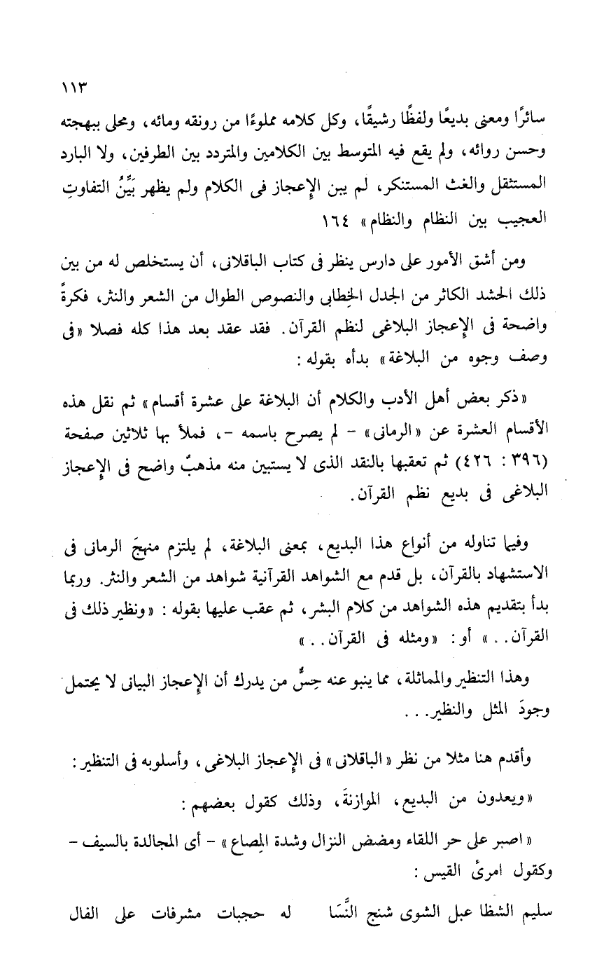 ومن أشق الأمور على دارس ينظر في كتاب الباقلانى، أن يستخلص له من بين ذلك الحشد الكاثر من الجدل الخطابي والنصوص الطوال من الشعر والنثر، فكرةَ ّواضحة في الإعجاز البلاغي لنظم القرآن. فقد عقد بعد هذا كله فصلاً "في وصف وجوه من البلاغة" بدأه بقوله: