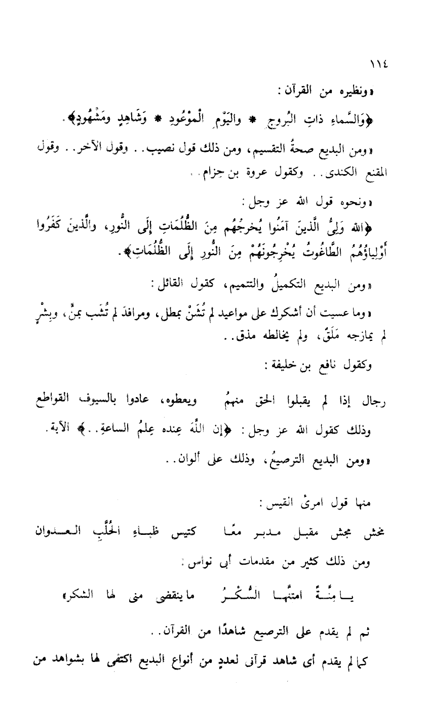 "ومن البديع صحةُ التقسيم، ومن ذلك قول نصيب. . . وقول الآخر. . . وقول المقنع الكندي. . . وكقول عروة بن حِزام. . .