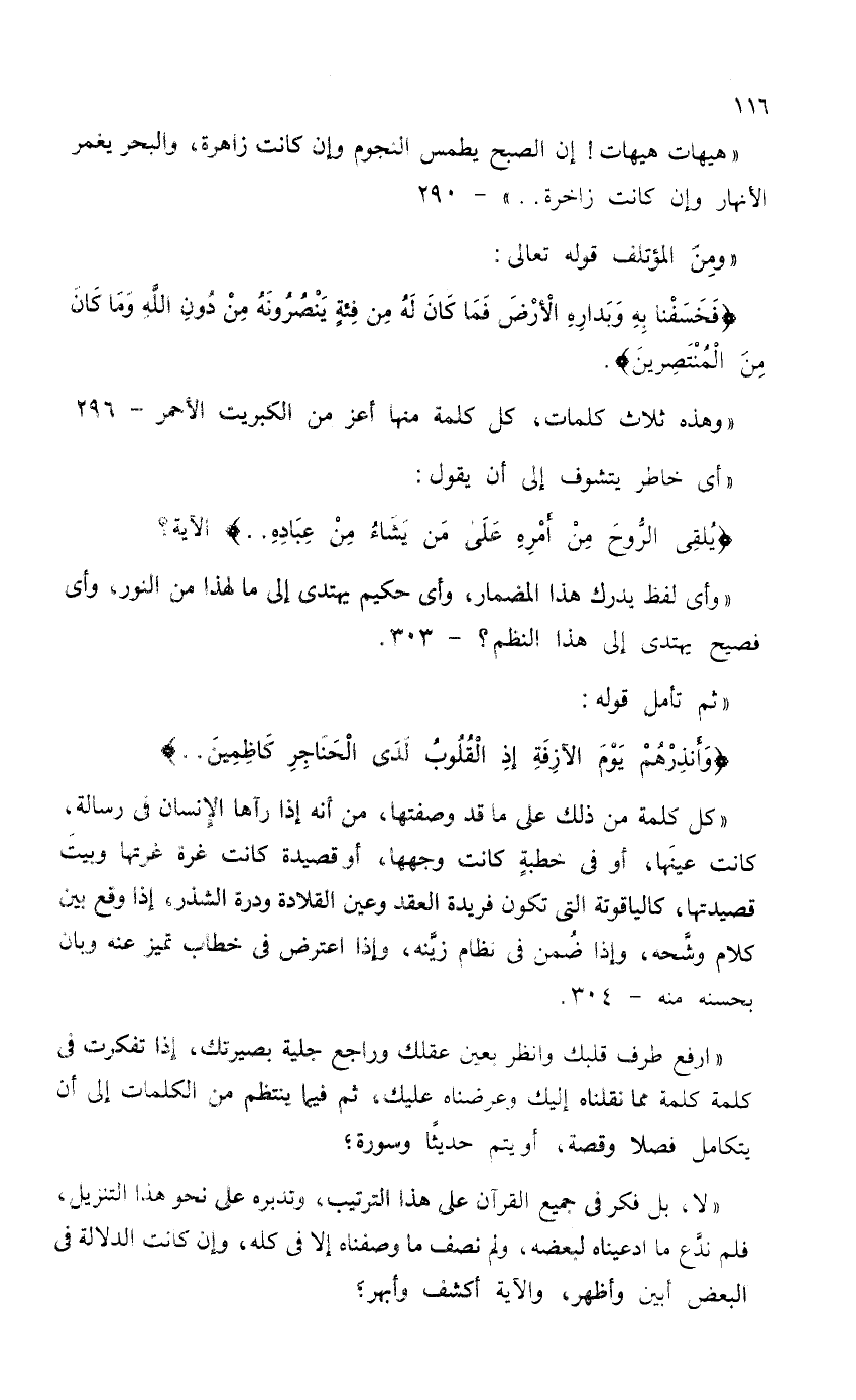 "وأي لفظ يدرك هذا المضمار، وأي حكيم يهتدي إلى ما لهذا من النور، وأي فصيح يهتدي إلى هذا النظم؟ - 303.