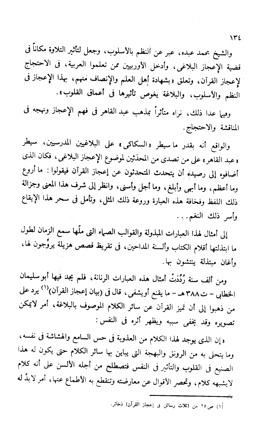 ومن ألف سنة رُدَّدَتْ أمثال هذه العبارات الرنانة، فلم يجد فيها أبو سليمان الخطابي - ت 388 هـ - ما يقنع أو يشفى، قال في (بيان إعجاز القرآن) يرد على من ذهبوا إلى أن تميز القرآن عن سائر الكلام الموصوف بالبلاغة، أمر لا يمكن تصويره وقد يخفى سببه ويظهر أثره في النفس: