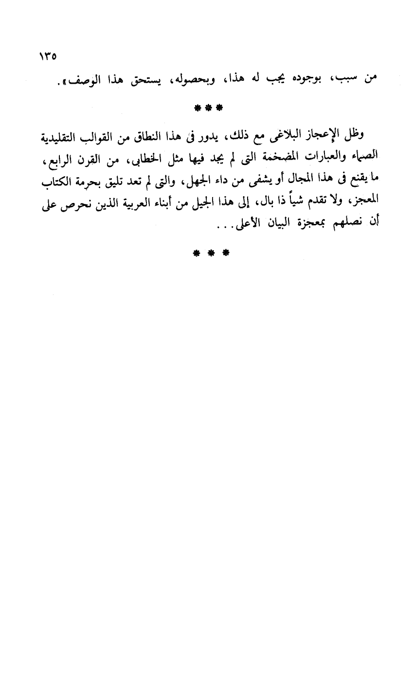 وظل الإعجاز البلاغي مع ذلك، يدور في هذا النطاق من القوالب التقليدية الصماء والعبارات المضخمة التي لم يجد فيها مثل الخطابي، من القؤرن الرابع، ما يقنع في هذا المجال أو يشفى من داء الجهل، والتي لم تعد تليق بحرمة الكتاب المعجز، ولا تقدم شياً ذا بال، إلى هذا الجيل من أبناء العربية الذين نحرص على أن نصلهم بمعجزة البيان الأعلى. . .