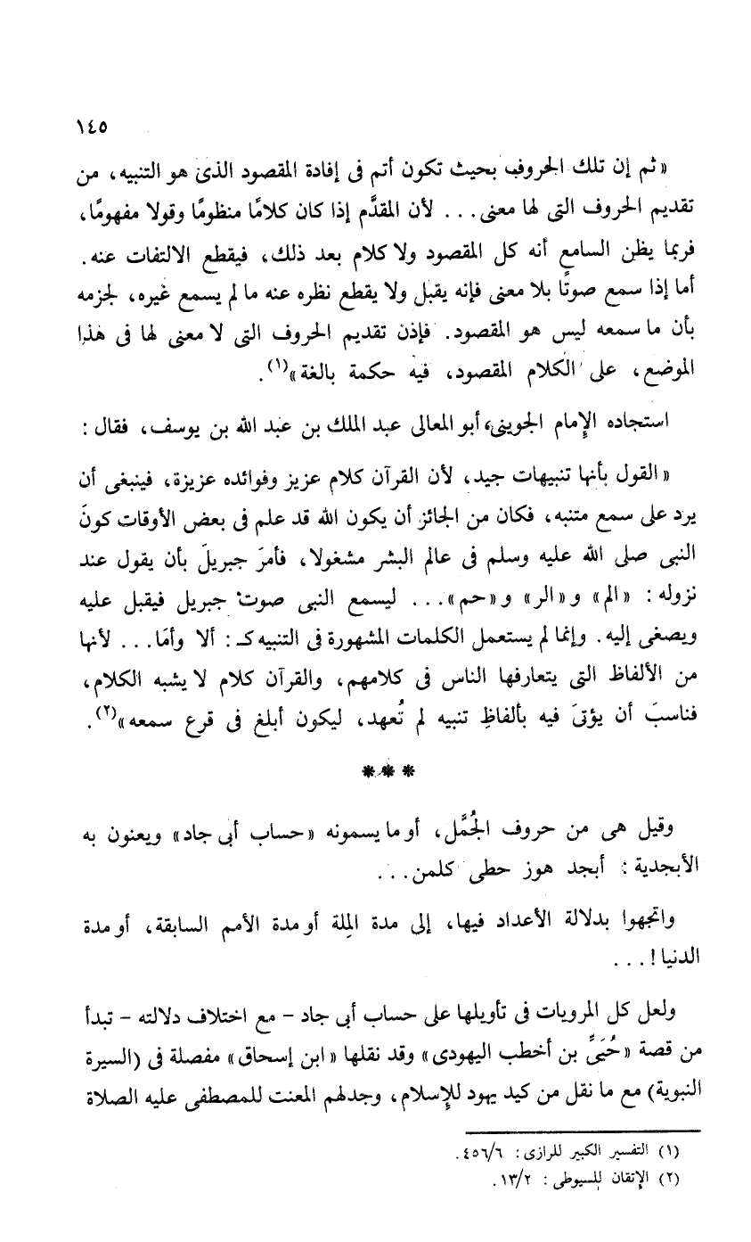 "ثم إن تلك الحروف بحيث تكون أتم في إفادة المقصود الذي هو التنبيه، من تقديم الحروف التي لها معنى. . . لأن المقدَّم إذا كان كلاماً منظموماً وقولاً مفهوماً، فربما يظن السامع أنه كل المقصود ولا كلام بعد ذلك، فيقطع الالتفات عنه. أما إذا سمع صوتاً بلا معنى فإنه يقبل ولا يقطع نظره عنه ما لم يسمع غيره، لجزمه بأن ما سمعه ليس هو المقصود. فإذن تقديم الحروف التي لا معنى لها في هذا الموضع، على الكلام المقصود، فيه حكمة بالغة".