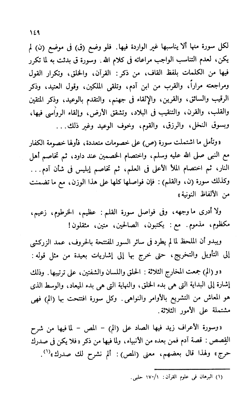 "وتأمب ما اشتملت سورة (ص) على خصومات متعددة، فأولها خصومة الكفار مع النبي - صلى الله عليه وسلم -، اختصام الخصمين عند داود، ثم تخاصم أهل النار، ثم اختصام الملأ الأعلى في العلم، ثم تخاصم إبليس في شأن آدم. . . وكذلك سورة (ن، والقلم) : فإن فواصلها كلها على هذا الوزن، مع ما تضمنت من الألفاظ النونية"