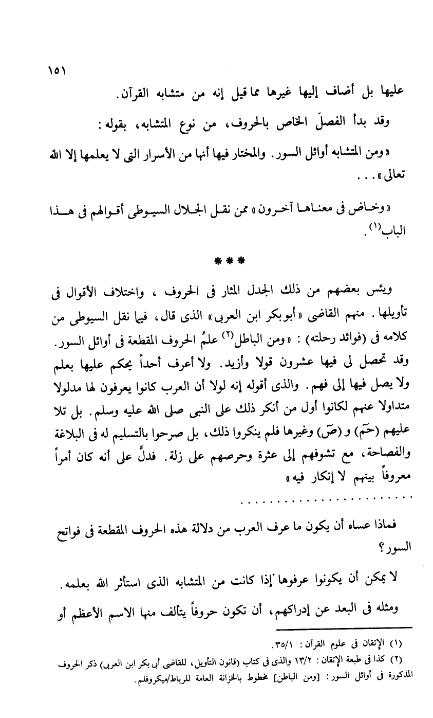 ويئس بعضهم من ذلك الجدل المثار في الحروف، واختلاف الأقوال في تأويلها. منهم القاضي "أبو بكر ابن العربي" الذي قال، فيكا نقل السيوطي من كلامه في (فوائد رحلته) : "ومن الباطل علمُ الحروف المقطعة في أوائل السور. وفد تحصل لي فيها عشرون قولاً وأزيد. ولا أعرف أحداً يحكم عليها بعلم ولا يصل فيها إلى فهم. والذي أقوله إنه لولا أن العرب كانوا يعرفون لها مدلولاً متداولاً عنهم لكانوا أول من أنكر ذلك على النبي - صلى الله عليه وسلم -. بلا تلا عليهم (حَمَ) و (صَ) وغيرها فلم ينكروا ذلك، بل صرحوا بالتسليم له في البلاغة والفصاحة، مع تشوفهم إلى عثرة وحرصهم على زلة. فدلَّ على أنه كان أمراً معروفاً بينهم لا إنكار فيه"