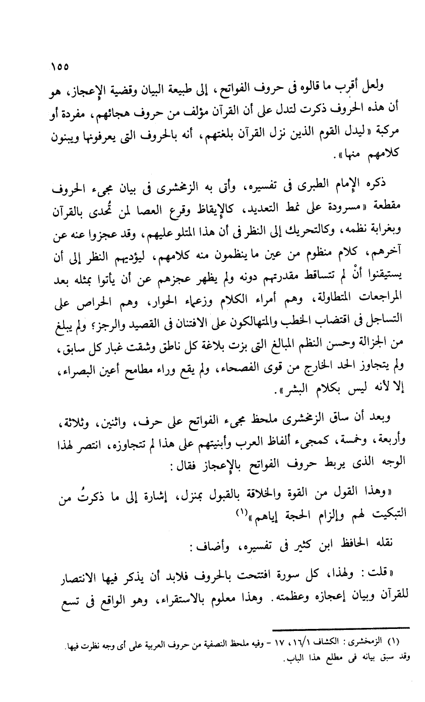 ذكره الإمام الطبري في تفسيره، وأتى به الزمخشري في بيان مجئ الحروف مقطعة "مسرودة على نمط التعديد، كالإيقاع وقرع العصا لمن تُحدى بالقرآن وبغرابة نظمه، وكالتحريك إلى النظر في أن هذا المتلو عليهم، وقد عجزوا عنه من آخرهم، كلام منظوم من عين ما ينظمون منه كلامهم، ليؤديهم النظر إلى أن يستيفنوا أنْ لم تتساقط مقدرتهمة دونه ولم يظهر عجزهم عن أن يأتوا بمثله بعد المراجعات المتطاولة، وهم أمراء الكلام وزعماء الحوار، وهم الحراص على التساجل في اقتضاب الخطب والمتهالكون على الافتنان في القصيد والرجز؛ ولم يبلغ من الجزالة وحسن النظم المبالغ التي بزت بلاغة كل ناطق وشقت غبار كل سابق، ولم يتجاوز الحد الخارج من قوى الفصحاء، ولم يقع وراء مطامح أعين البصراء إلا لأنه ليس بكلام البشر".