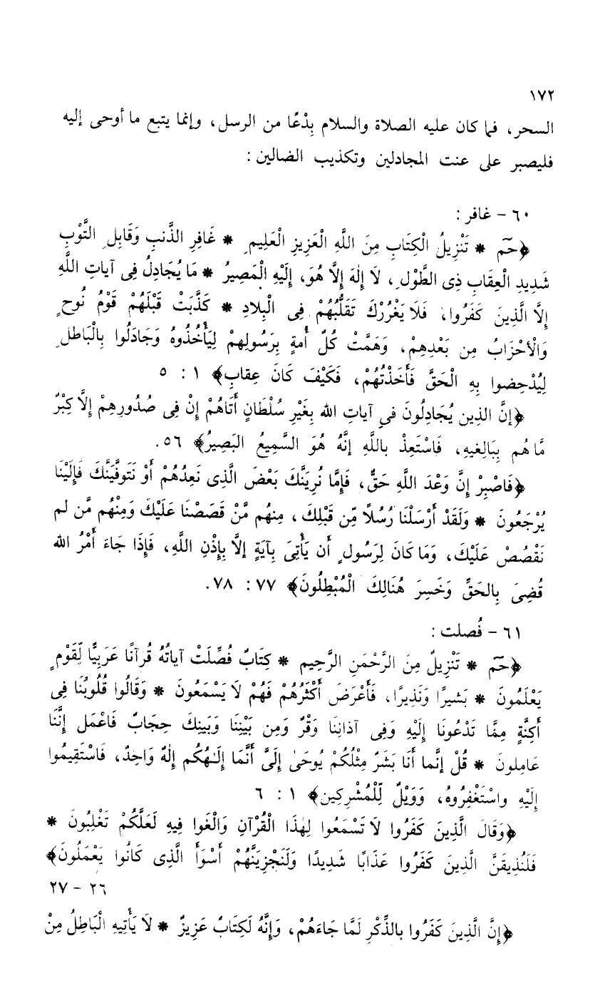 {حم (1) تَنْزِيلُ الْكِتَابِ مِنَ اللَّهِ الْعَزِيزِ الْعَلِيمِ (2) غَافِرِ الذَّنْبِ وَقَابِلِ التَّوْبِ شَدِيدِ الْعِقَابِ ذِي الطَّوْلِ لَا إِلَهَ إِلَّا هُوَ إِلَيْهِ الْمَصِيرُ (3) مَا يُجَادِلُ فِي آيَاتِ اللَّهِ إِلَّا الَّذِينَ كَفَرُوا فَلَا يَغْرُرْكَ تَقَلُّبُهُمْ فِي الْبِلَادِ (4) كَذَّبَتْ قَبْلَهُمْ قَوْمُ نُوحٍ وَالْأَحْزَابُ مِنْ بَعْدِهِمْ وَهَمَّتْ كُلُّ أُمَّةٍ بِرَسُولِهِمْ لِيَأْخُذُوهُ وَجَادَلُوا بِالْبَاطِلِ لِيُدْحِضُوا بِهِ الْحَقَّ فَأَخَذْتُهُمْ فَكَيْفَ كَانَ عِقَابِ} 1: 5