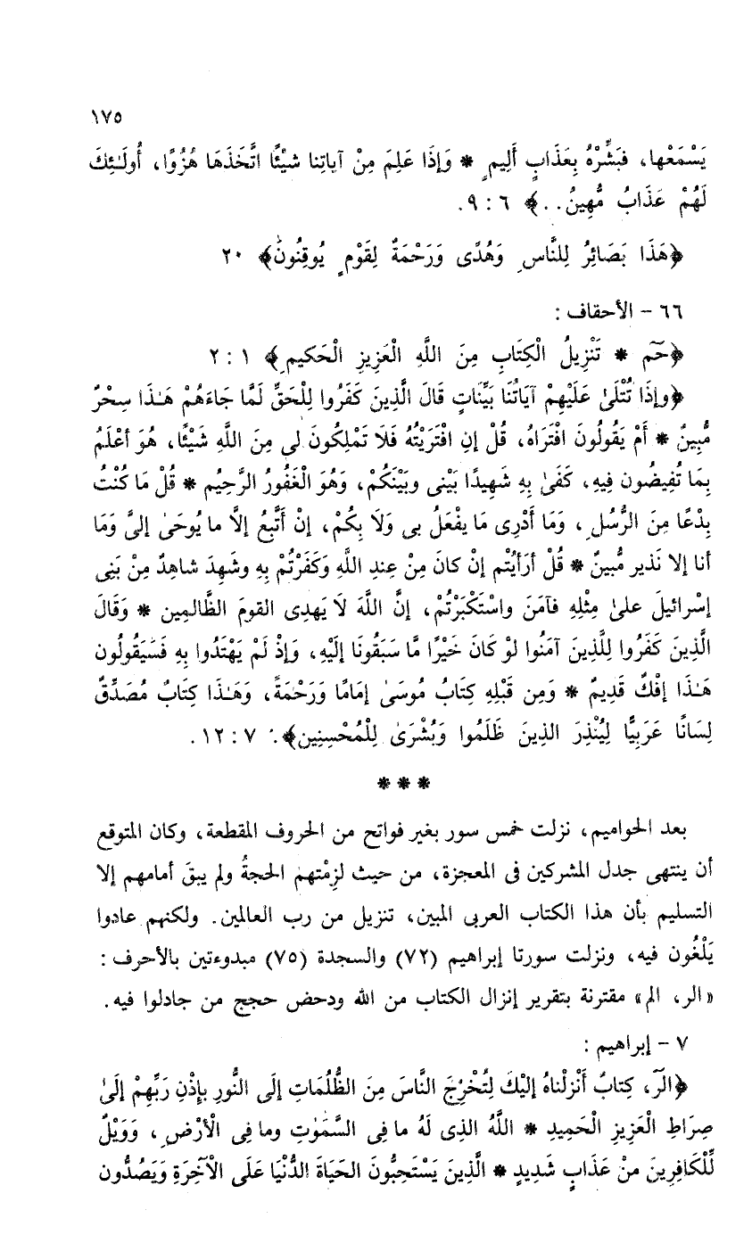 بعد الحواميم، نزلت خمس سور بغير فواتح من الحروف المقطعة، وكان المتوقع أن ينتهي جدل المشركين في المعجزة، من حيث لزِمْتهم الحجةُ ولم يبقَ أمامهم إلا التسليم بأن هذا الكتاب العربي المبين، تنزيل من رب العالمين. ولكنهم عادوا يَلْغُون فيه، ونزلت سورتا إبراهيم (72) والسجدة (75) مبدوءتين بالأحرف: "الر، الم" مقترنة بتقرير إنزال الكتاب من الله ودحض حجج من جادلوا فيه.